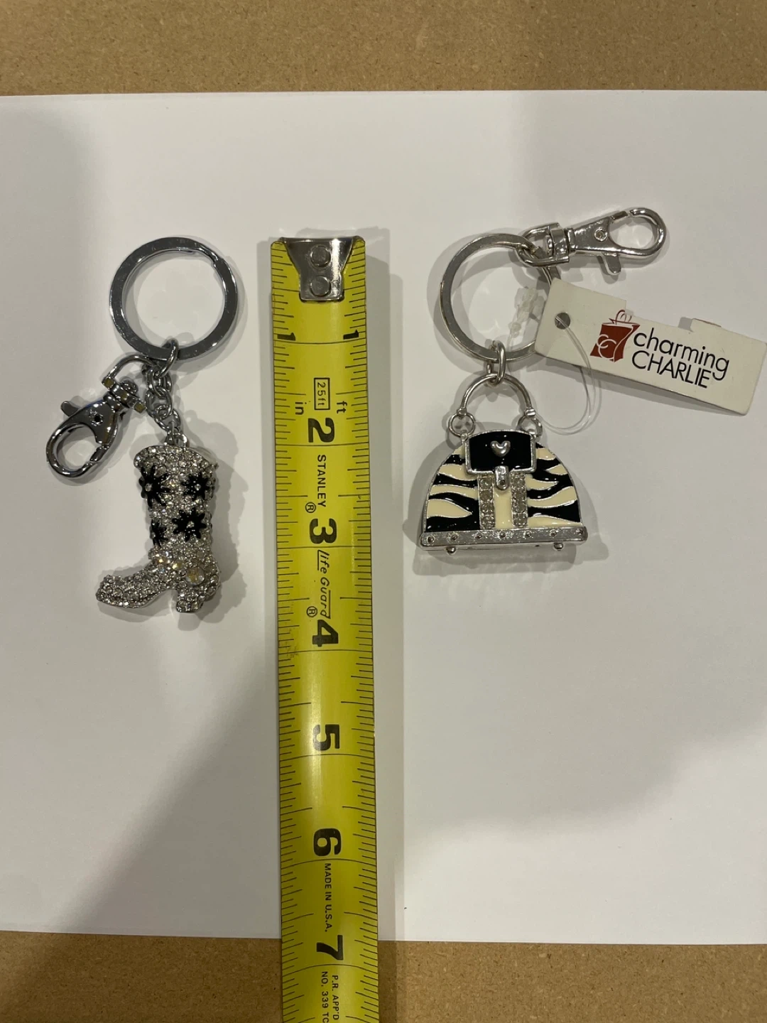 Two adorable keychains from Charming Charlie! Both are new/never used; one with tag. One is shaped like a purse with a zebra-like pattern, and the other is a sparkly cowboy boot. Perfect for adding a bit of charm to your keys or bag. $8 each. Will sell separately.