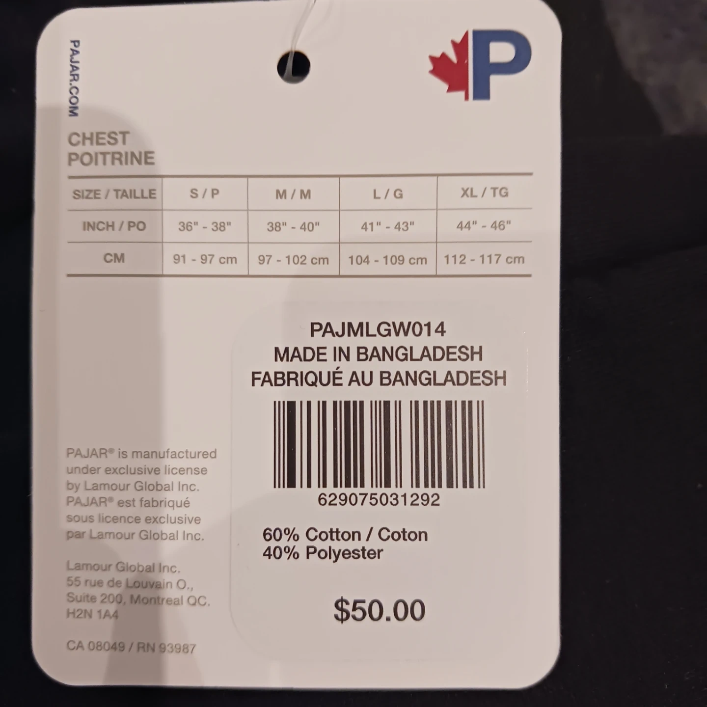 Selling a brand new Pajar Canada men's loungewear top in size large. It's made of 60% cotton and 40% polyester. The colour is a dark black.