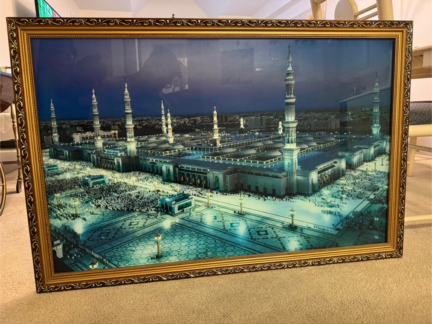 Beautiful framed print of Masjid al-Nabawi. The frame is gold and ornate, adding a touch of elegance to the artwork. It would look great in any home or office