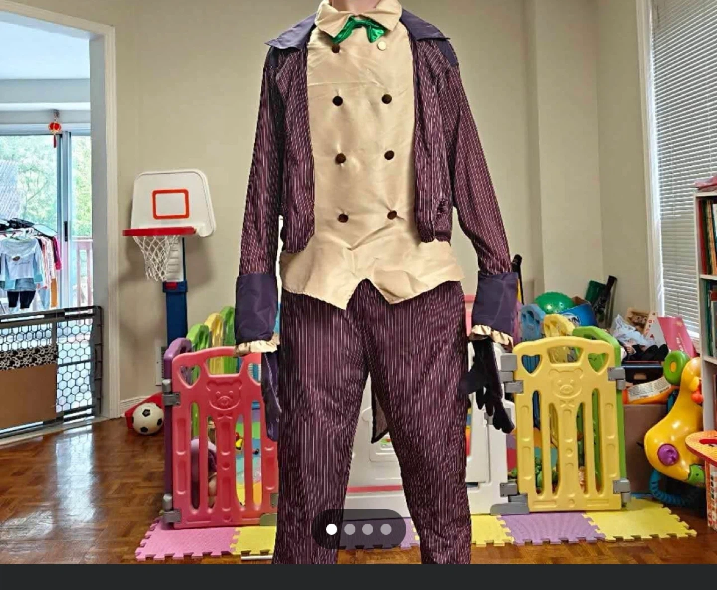 Selling a men's Halloween costume. It's a purple and cream coloured suit with pinstripes. Includes jacket, pants, shirt and gloves. Perfect for a Halloween party!