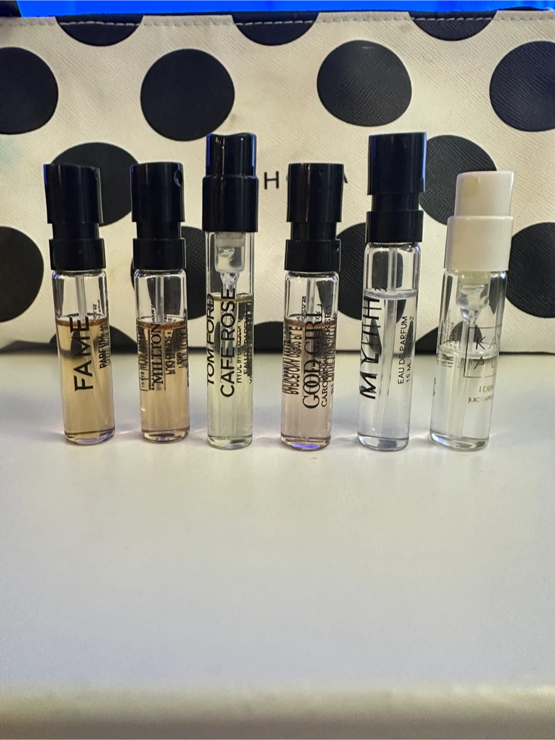 Selling a set of perfume samples including Fame, Million, Tom Ford Cafe Rose, Good Girl, and Myth
