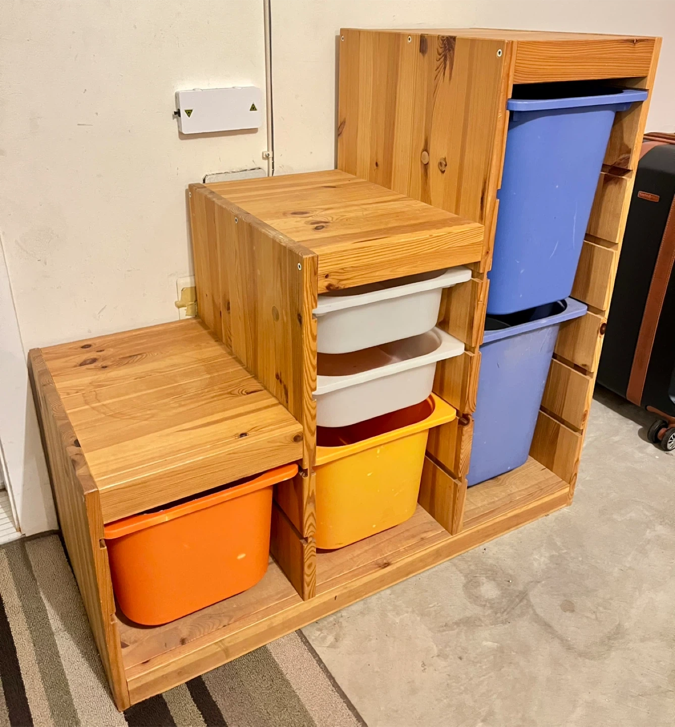 73MOVING OUT GIVEAWAY! A storage shelf unit (stained pine finish) with bins from IKEA - perfect as a storage organizer or shoe shelf. Wood frame has several grooves so bins and trays can be placed however. Clean, sturdy, gently used. Wood shelf frame in great condition; bins have some wear but still fully functional and easily replaceable. *Pick up only