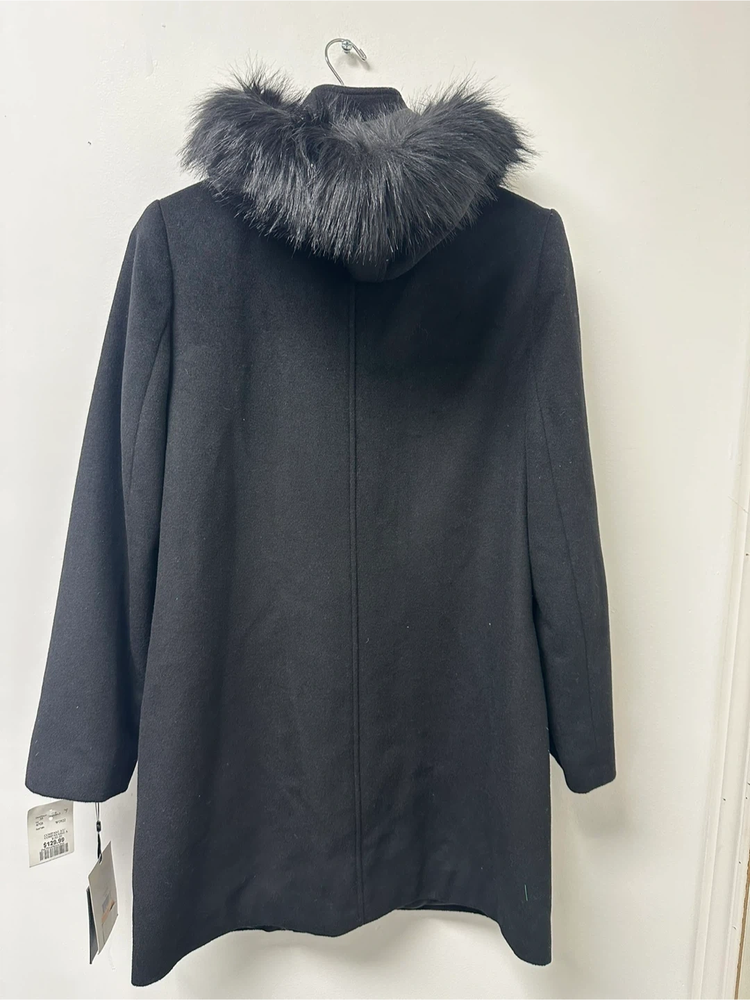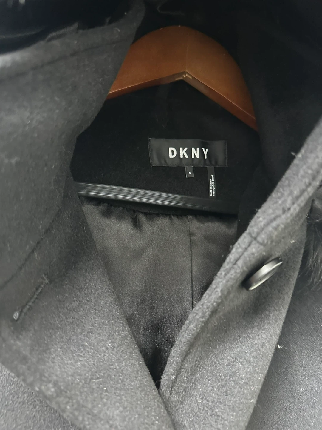 A stylish DKNY black coat, perfect for staying warm this season! It features a cozy faux fur hood and is a size small. Great for layering and adding a touch of elegance to your outfit