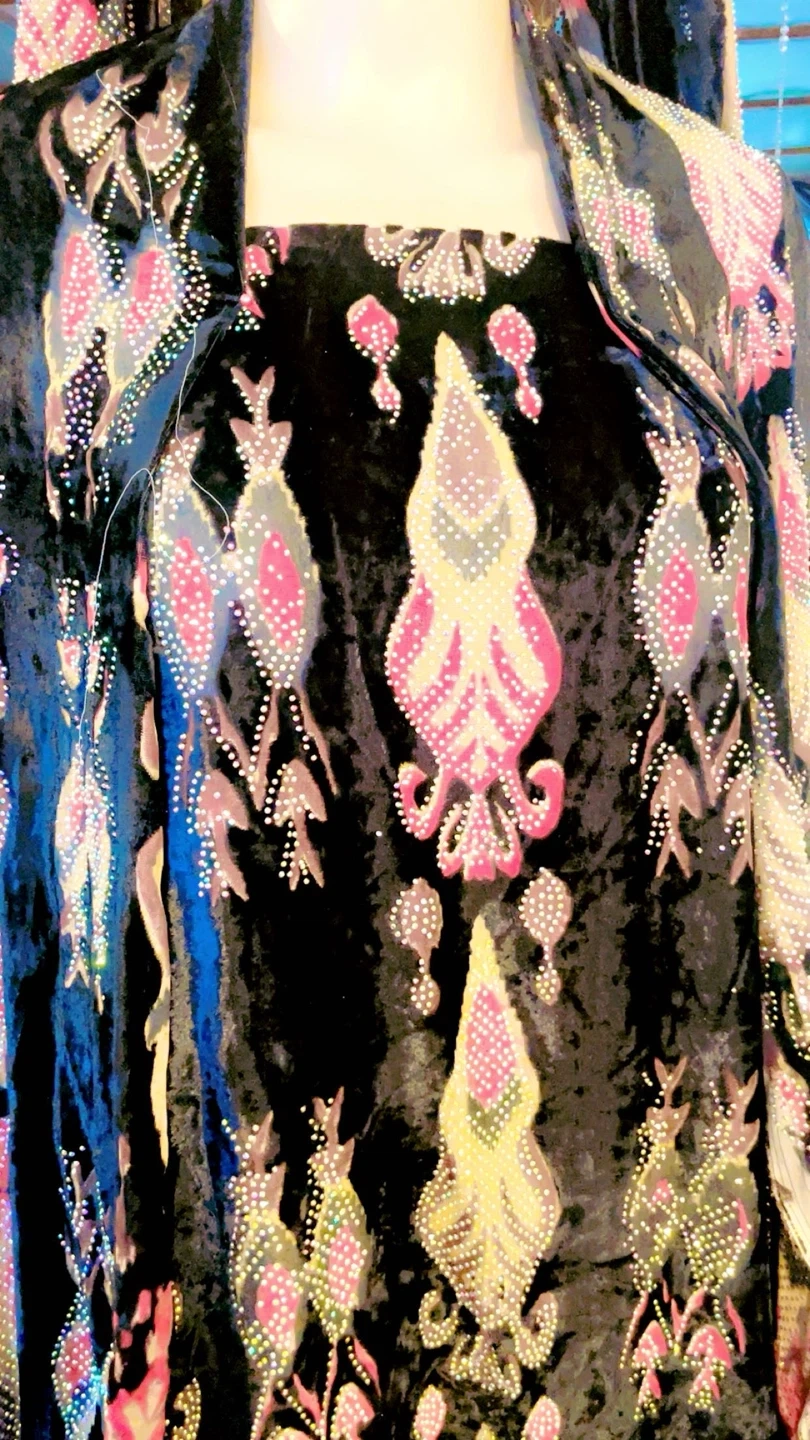 Beautiful dress fabric with unique embellishments! The fabric features various colours and patterns, perfect for creating a standout piece. It's in great condition and ready to be transformed into your next favourite outfit