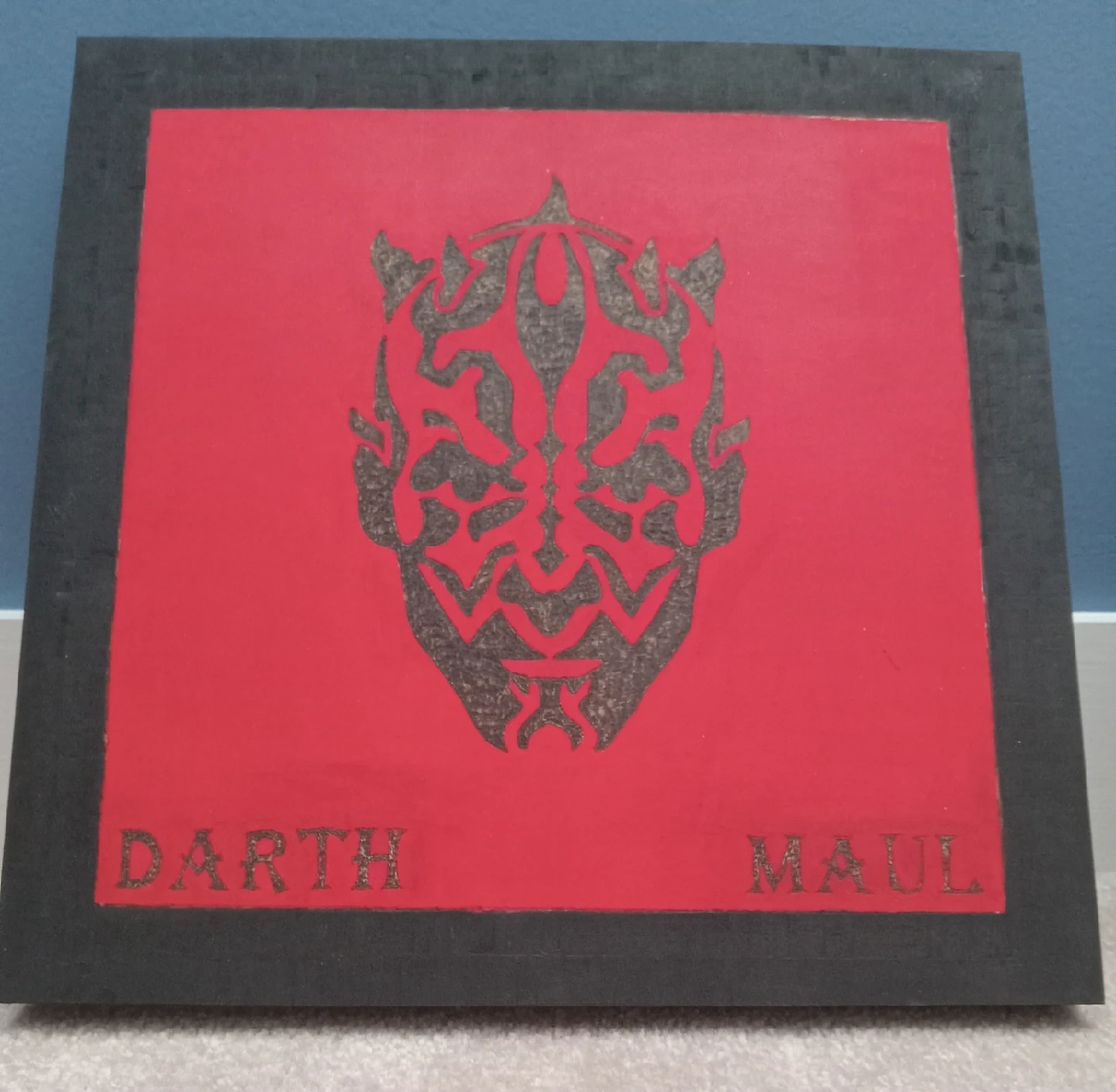 Darth Maul art piece in a black frame with a red background. The piece was made with a mix of acrylic paint and wood burning techniques.The image is a stencil of Darth Maul's face. Perfect for any Star Wars fan!