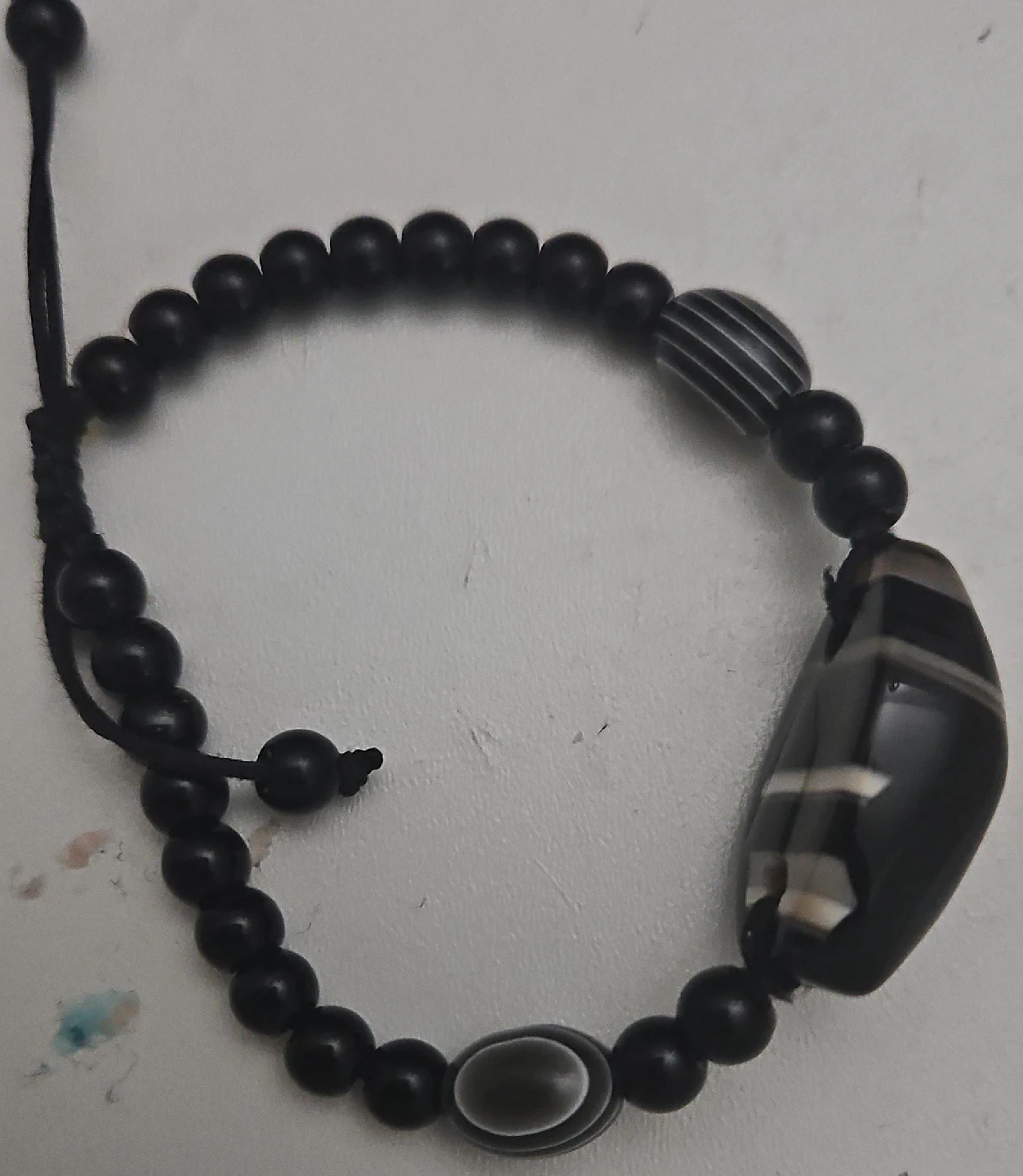 Selling a beaded bracelet with black beads and a unique striped accent bead. It's in great condition and ready to add a touch of style to your wrist