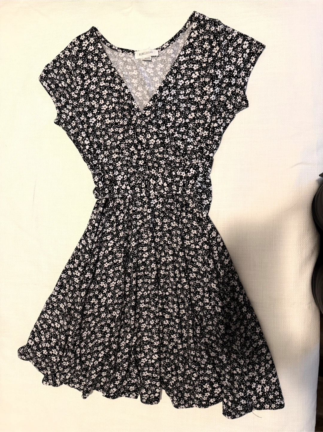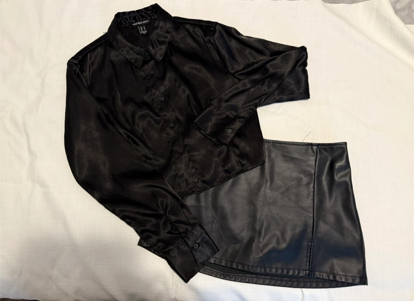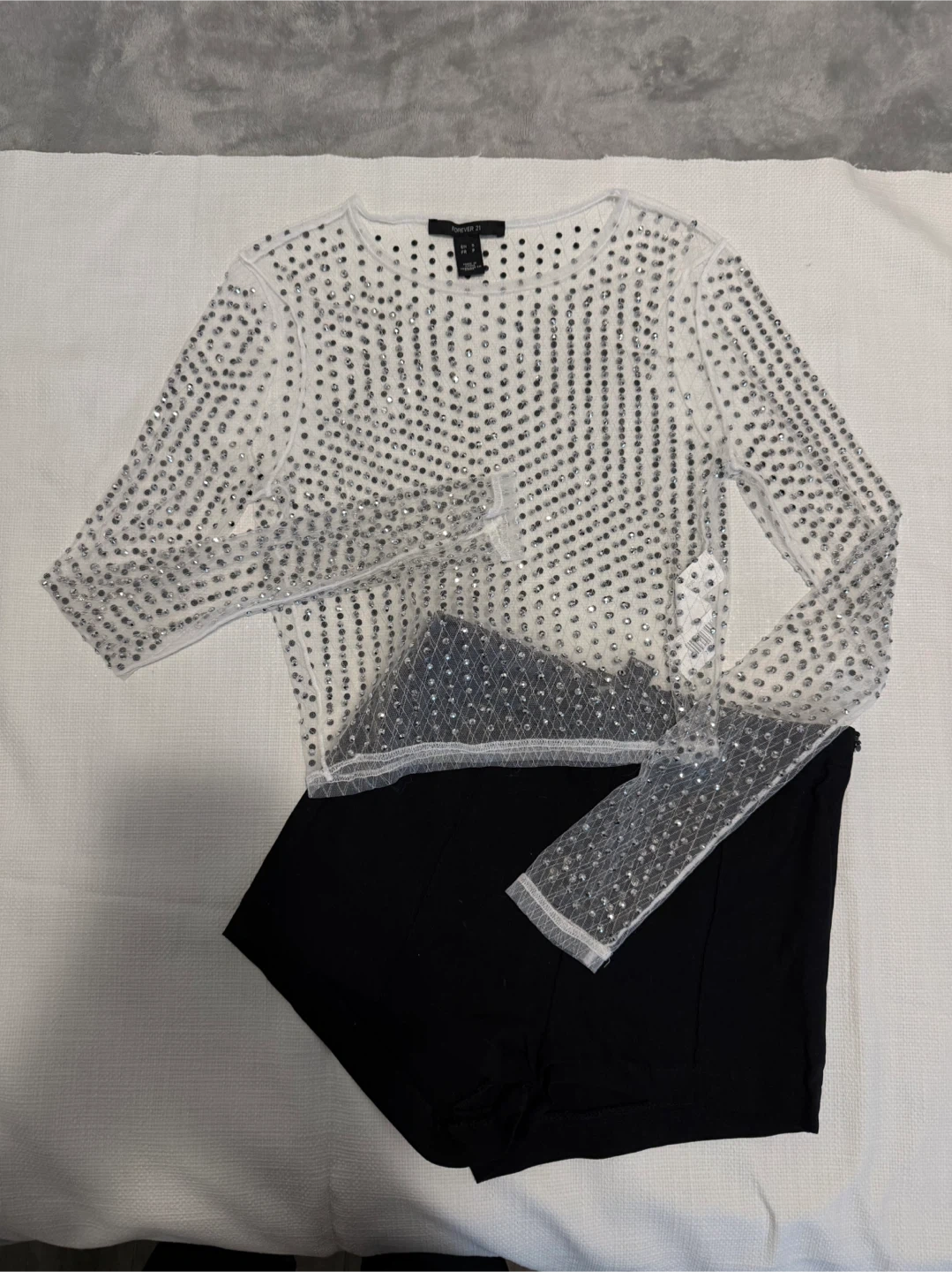 12Selling a collection of women's tops and bottoms. The tops include a white off-the-shoulder top, a black long-sleeve button-up, and a patterned bustier-style top. The bottoms include denim shorts and black shorts. All items are in good condition and ready for a new home