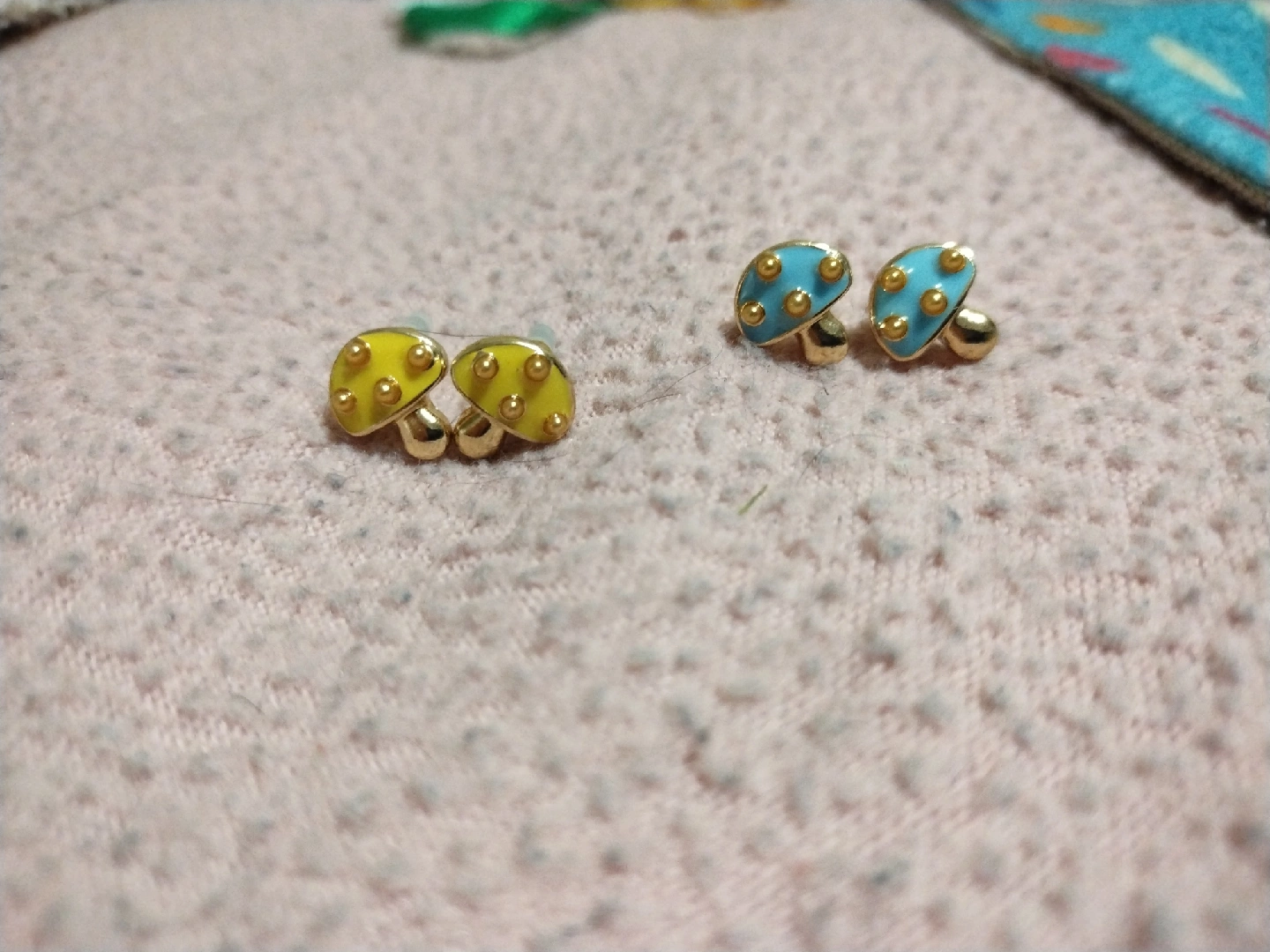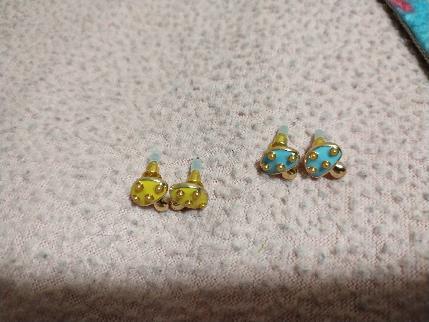 Cute mushroom stud earrings! One pair is a cheerful yellow and the other is a lovely blue. Perfect for adding a touch of whimsy to any outfit! Both are brand new. $4 for both pairs together.