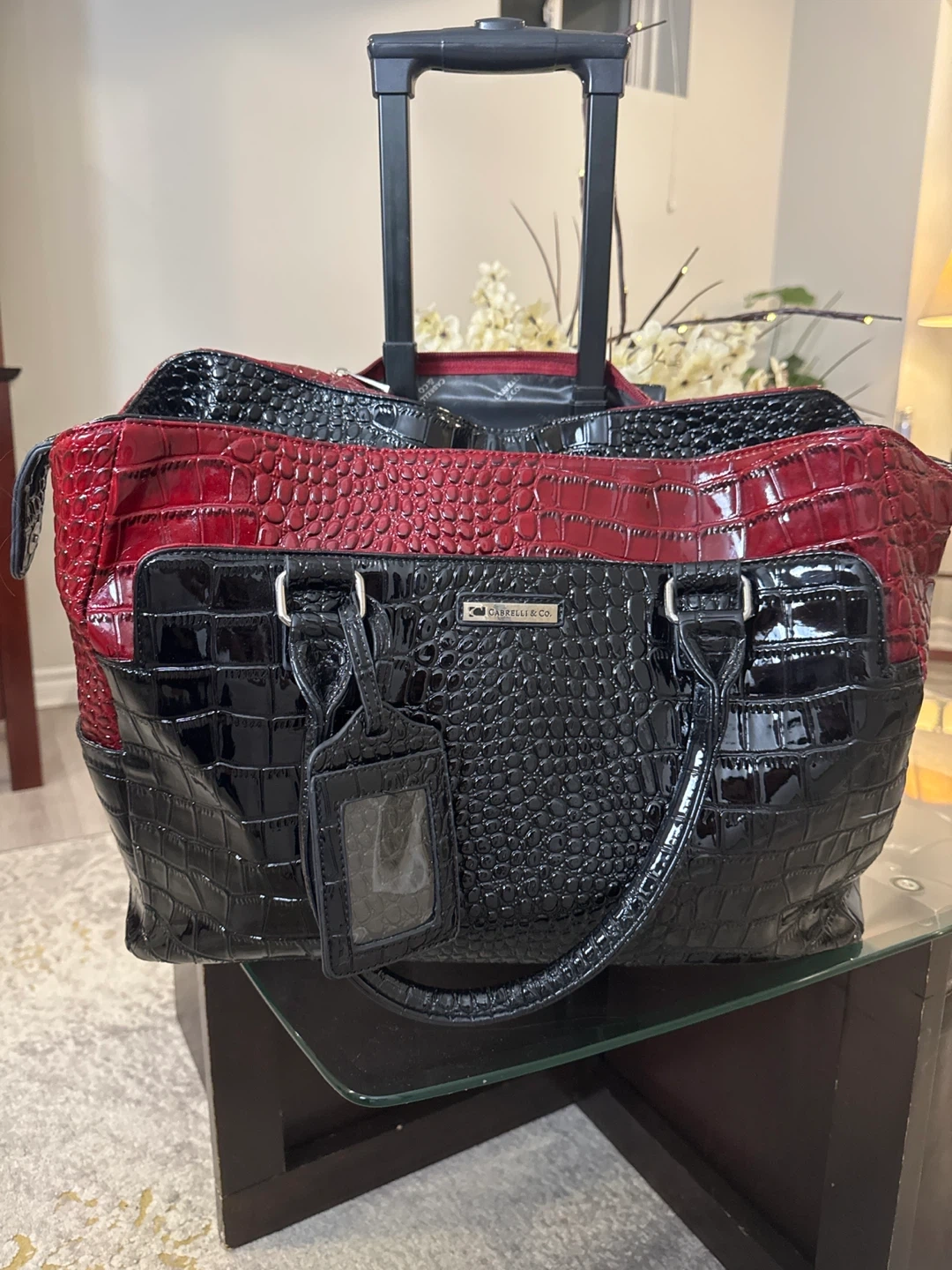 Rolling travel tote bag by CAPPELLETTI & CO in a stylish black and red color scheme! It features a unique crocodile-like texture and a convenient extendable handle for easy transport. Perfect for your next trip!