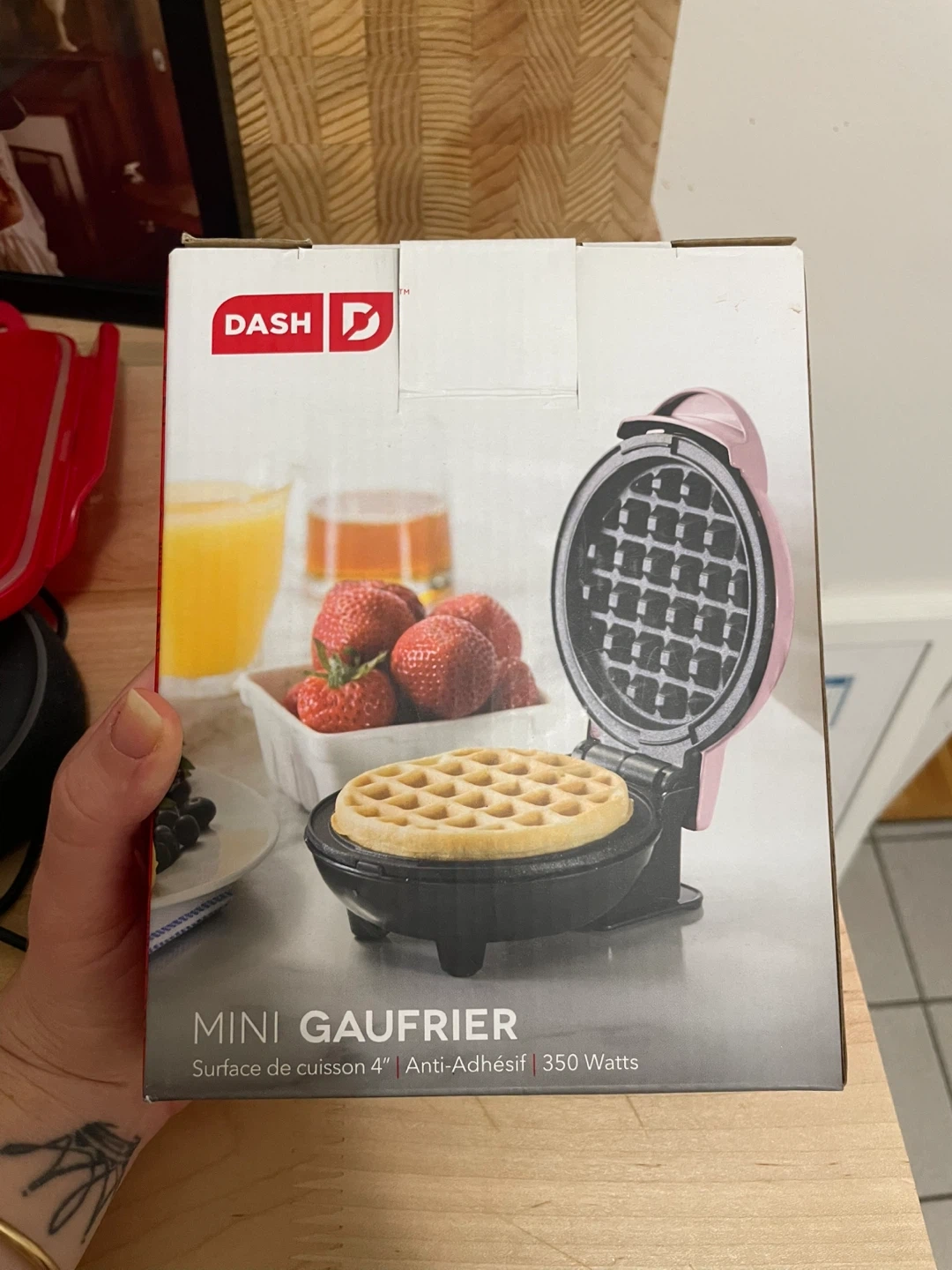 Selling a lightly used Dash Mini Waffle Maker in pink! It's still in its original box and has only been used once or twice. Perfect for making single-serve waffles, and its compact size makes it easy to store. The cooking surface is 4" and it's anti-adhesive with 350 Watts