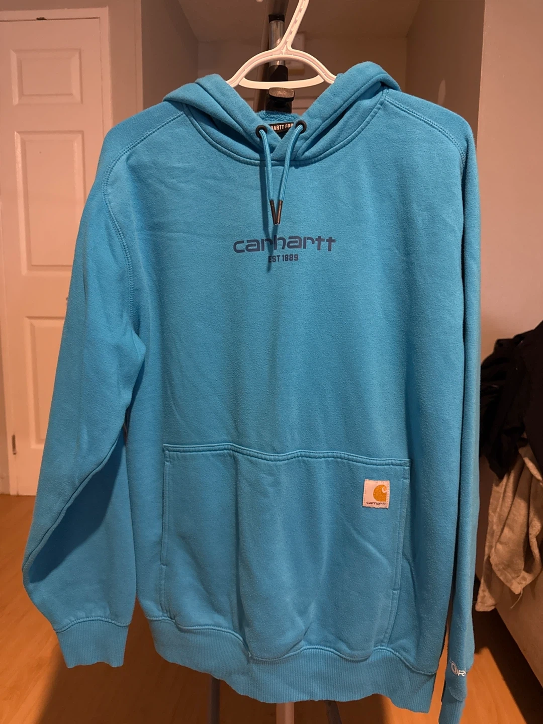Selling a Carhartt hoodie in a nice baby blue colour! It's in good condition and ready for a new home