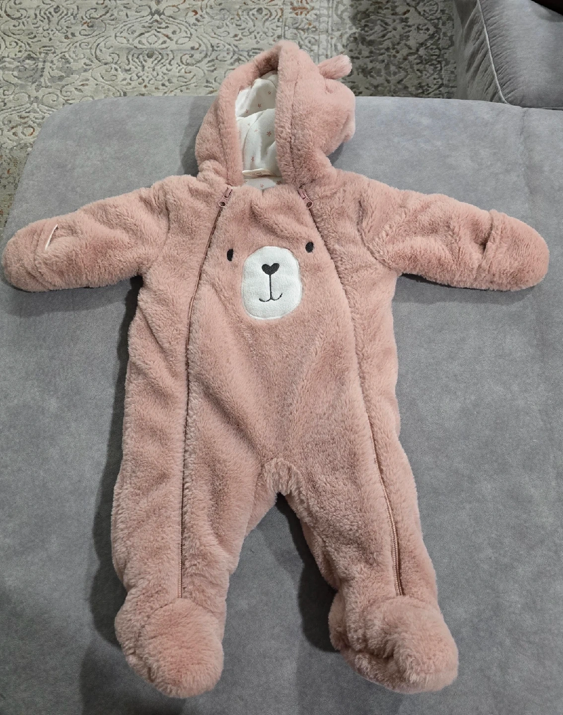 Super cute and cozy pink bear onesie for your little one! It's in great condition and ready to keep your baby warm and snuggly. The onesie features a hood with adorable bear ears and a sweet bear face on the front. Perfect for those chilly Canadian days!