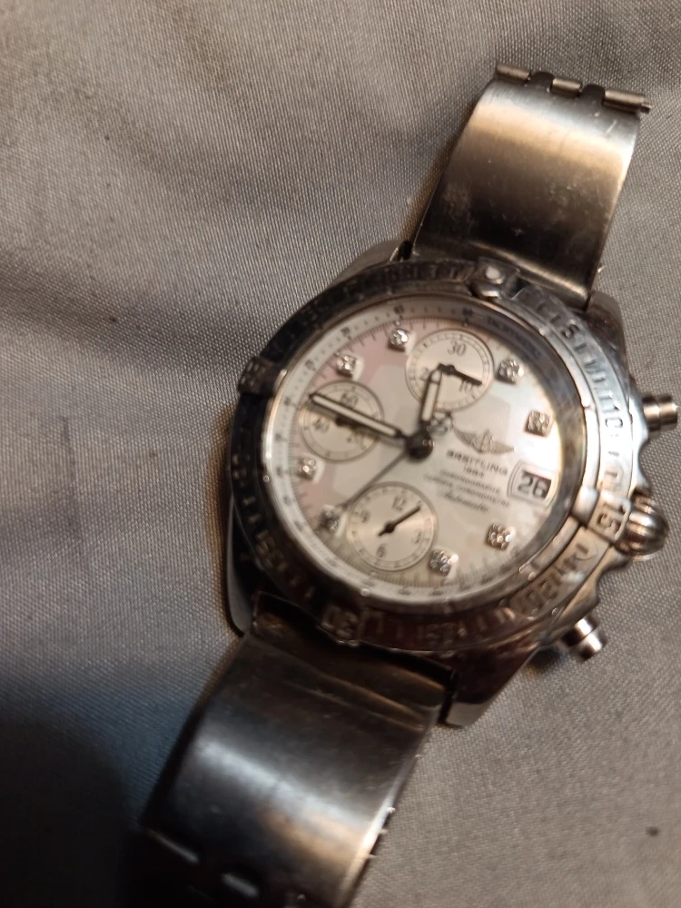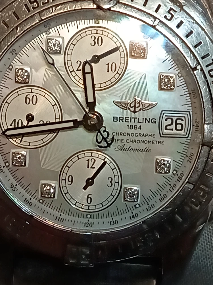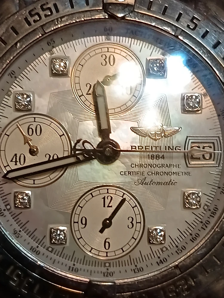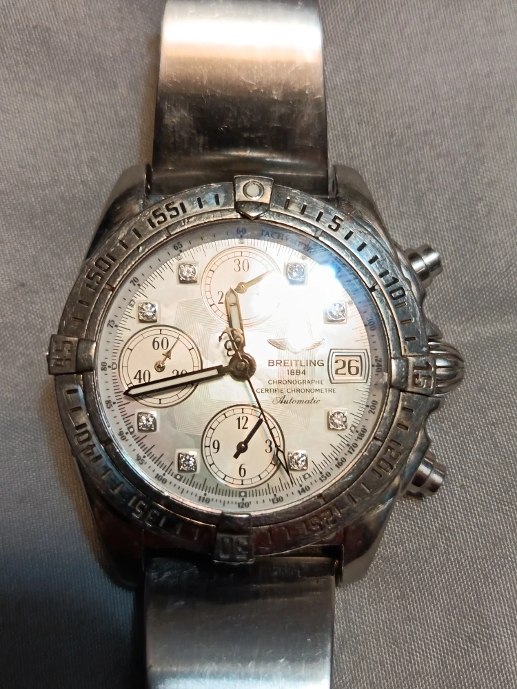 10Selling a Breitling Chronograph Certifie Chronometre Automatic watch. This timepiece features a stainless steel band and a mother-of-pearl dial with diamond hour markers. The watch has chronograph subdials and a date display.