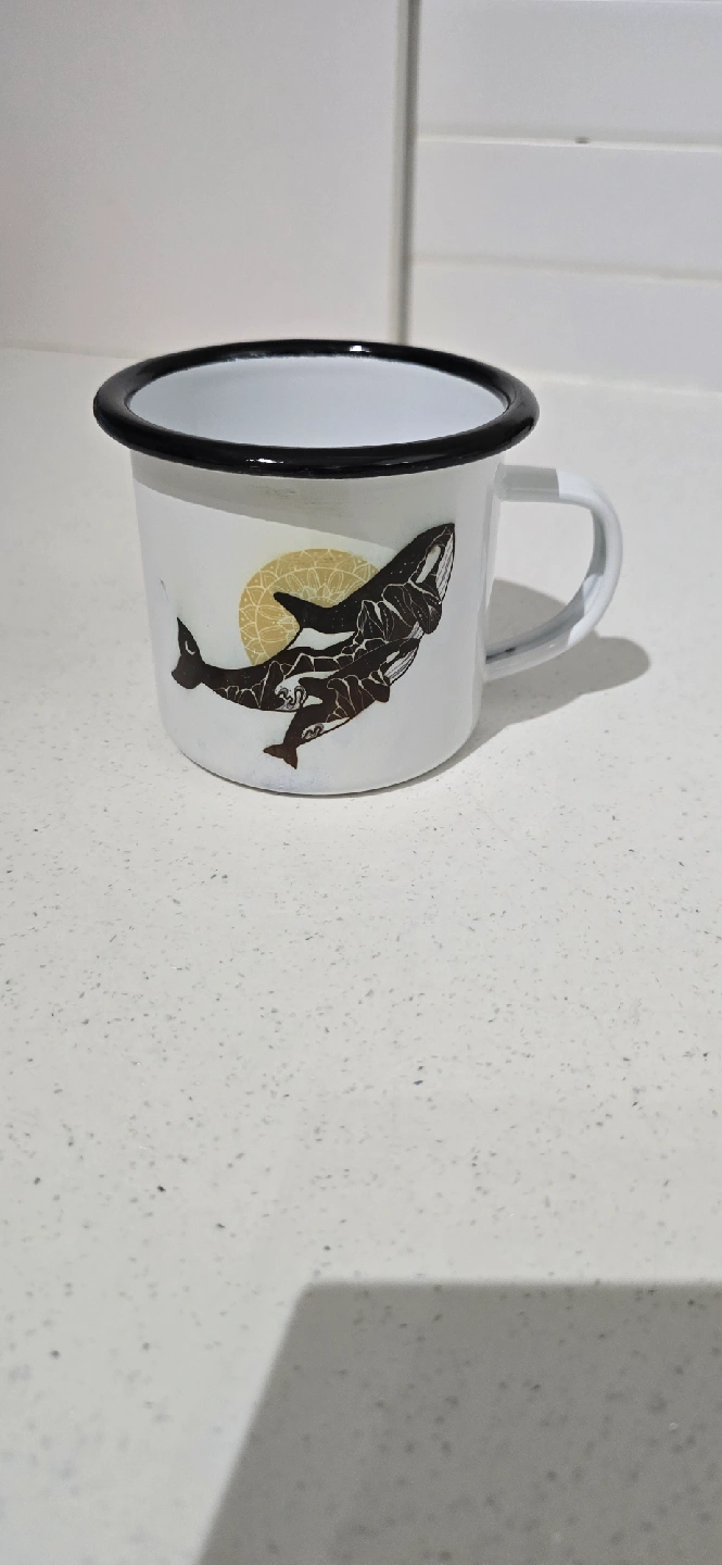 143A cute enamel mug featuring a unique whale design. Perfect for camping, picnics, or just enjoying your morning coffee! It's in great condition and ready for a new home