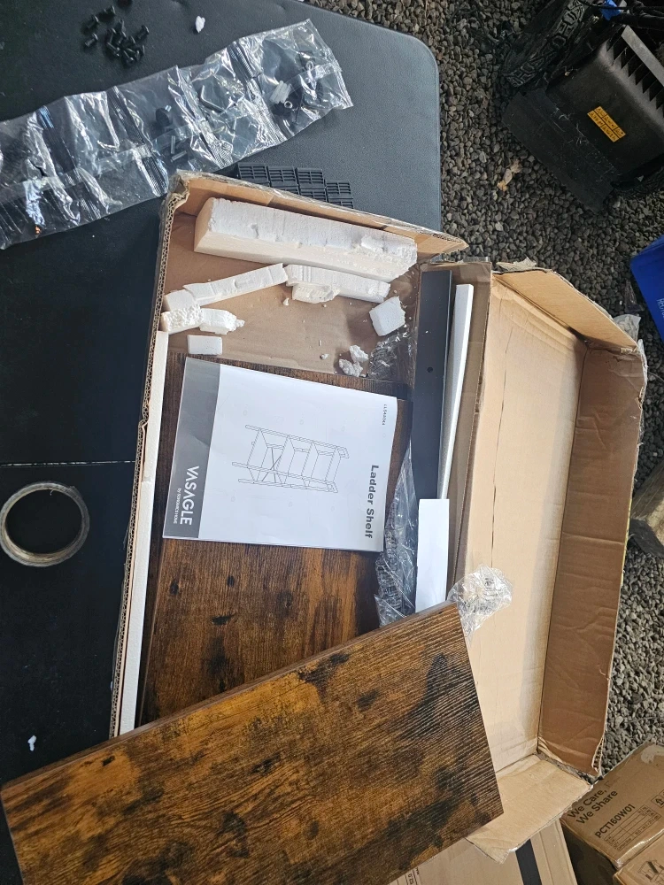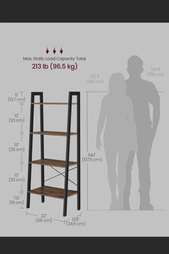 Selling a VASAGLE ladder shelf in rustic brown and black. It's in great condition and ready to add some style to your home! The shelf has four tiers, providing ample storage and display space. It measures 5.2 feet tall and 22 inches wide. Max static load capacity is 213 lb (96.5 kg).