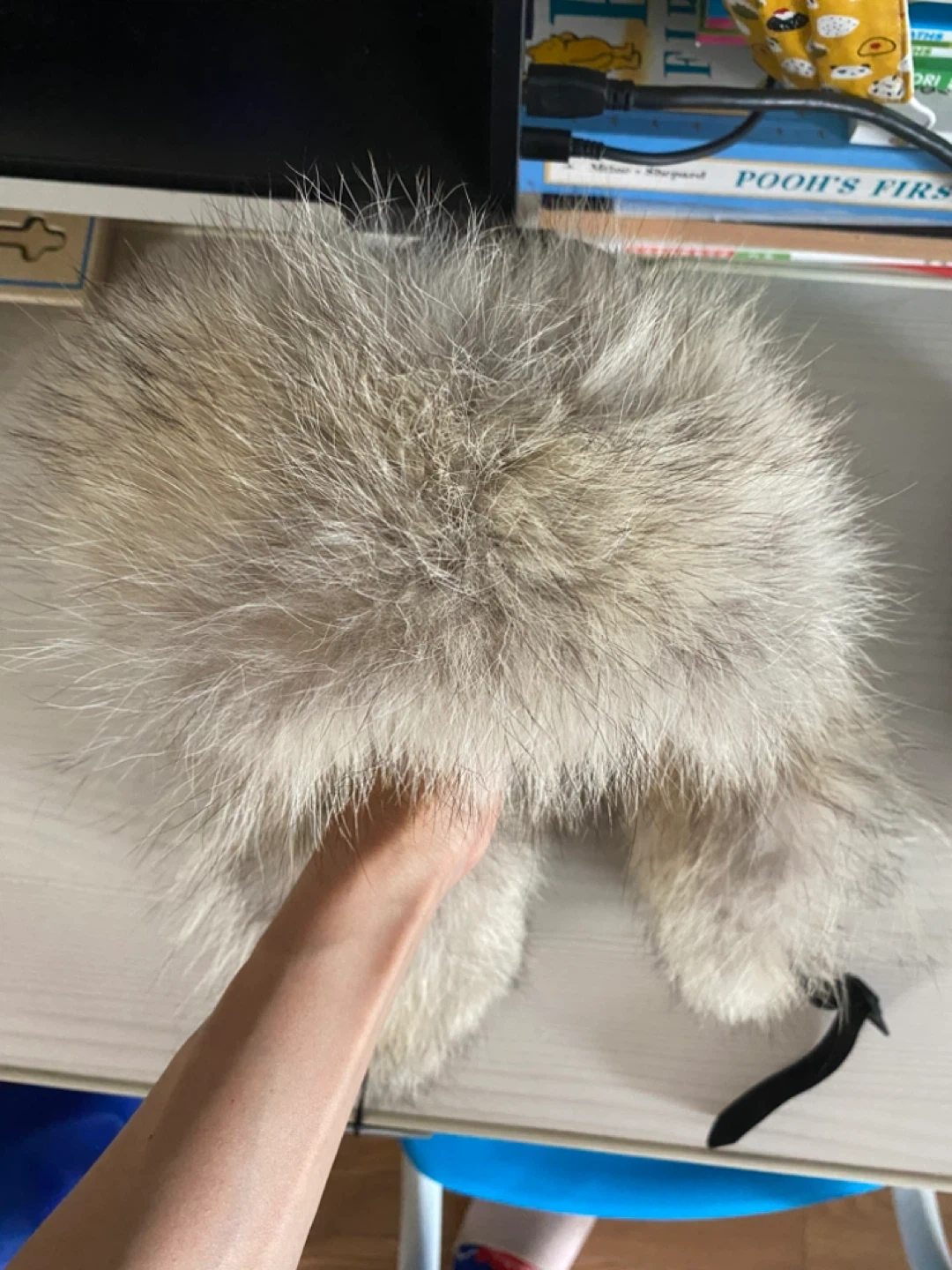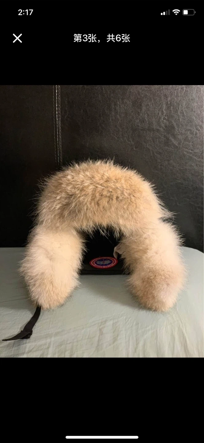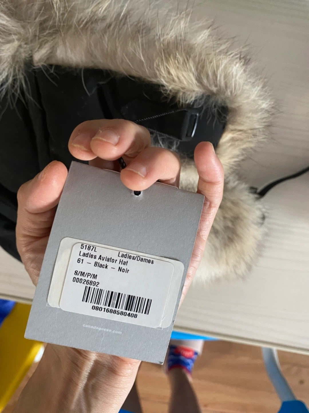 65Selling a Canada Goose Ladies Aviator Hat in size S/M. It's black with real fur trim. The tag shows the style number is 5187L.