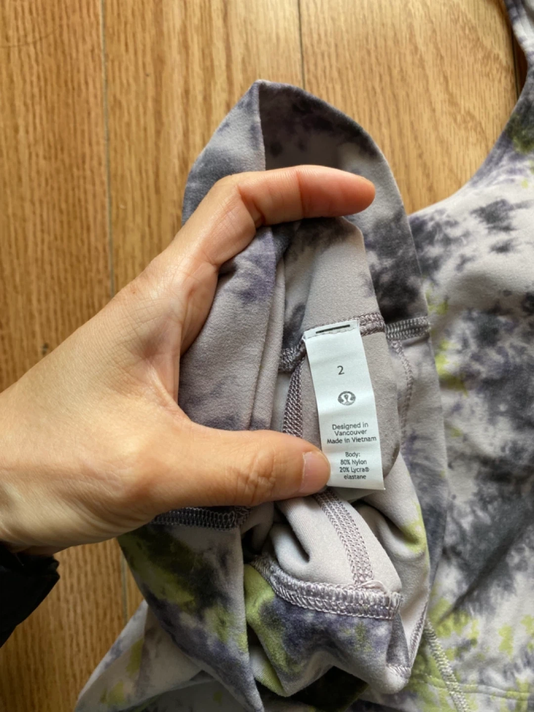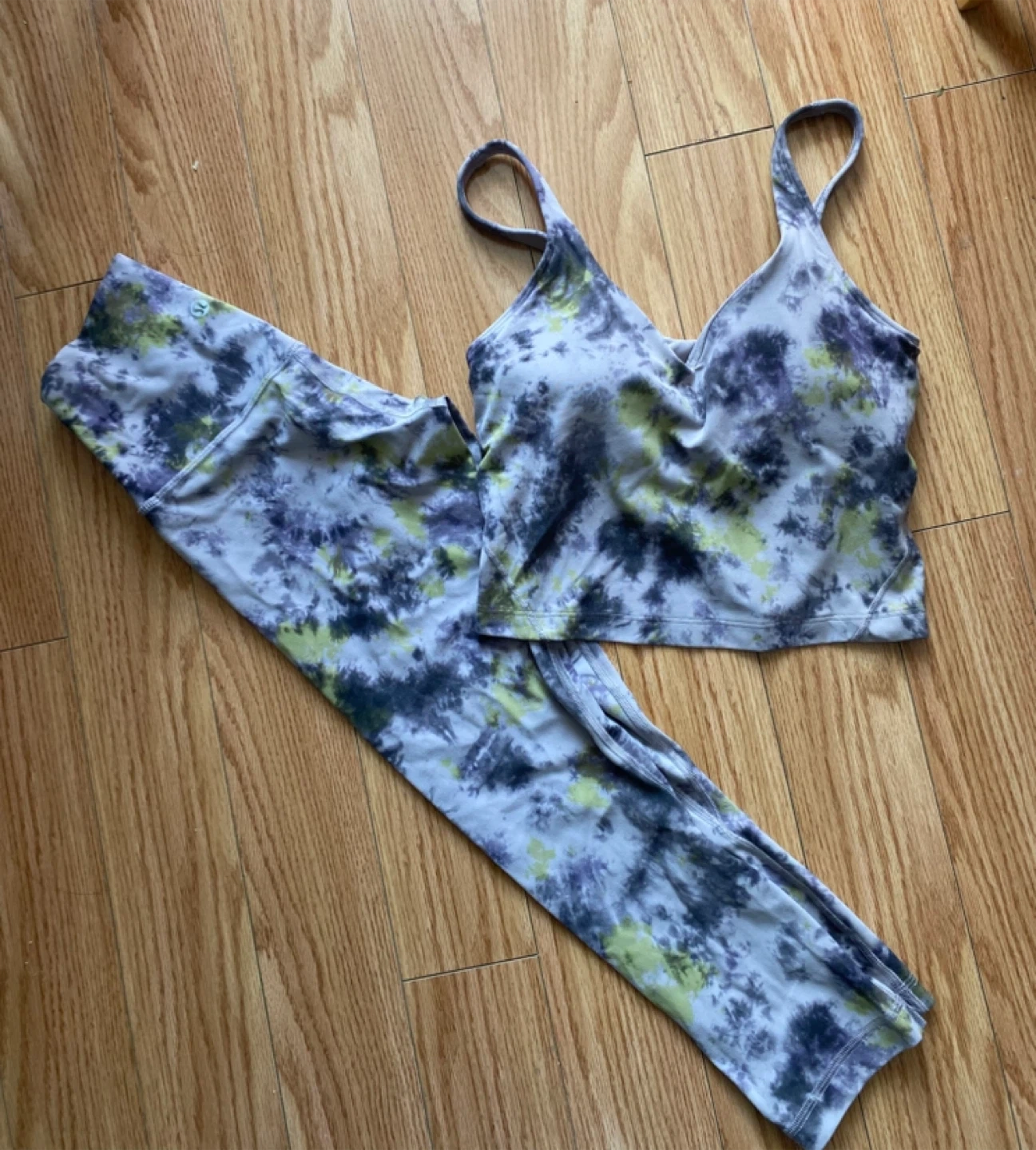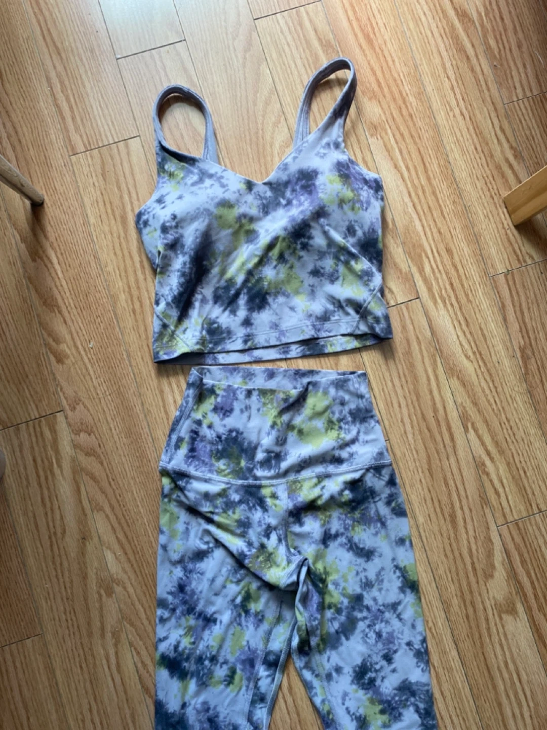 65Selling a Lululemon workout set in a cool tie-dye pattern! Includes a sports bra top and matching leggings. Great for yoga, running, or just lounging around