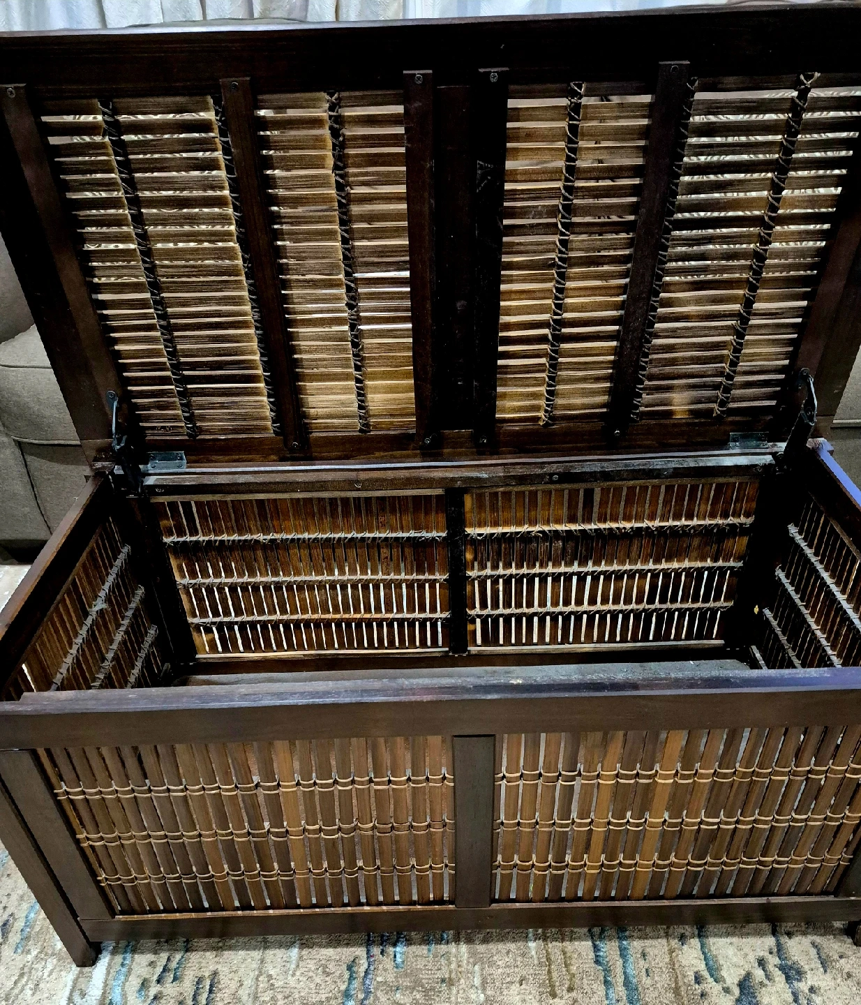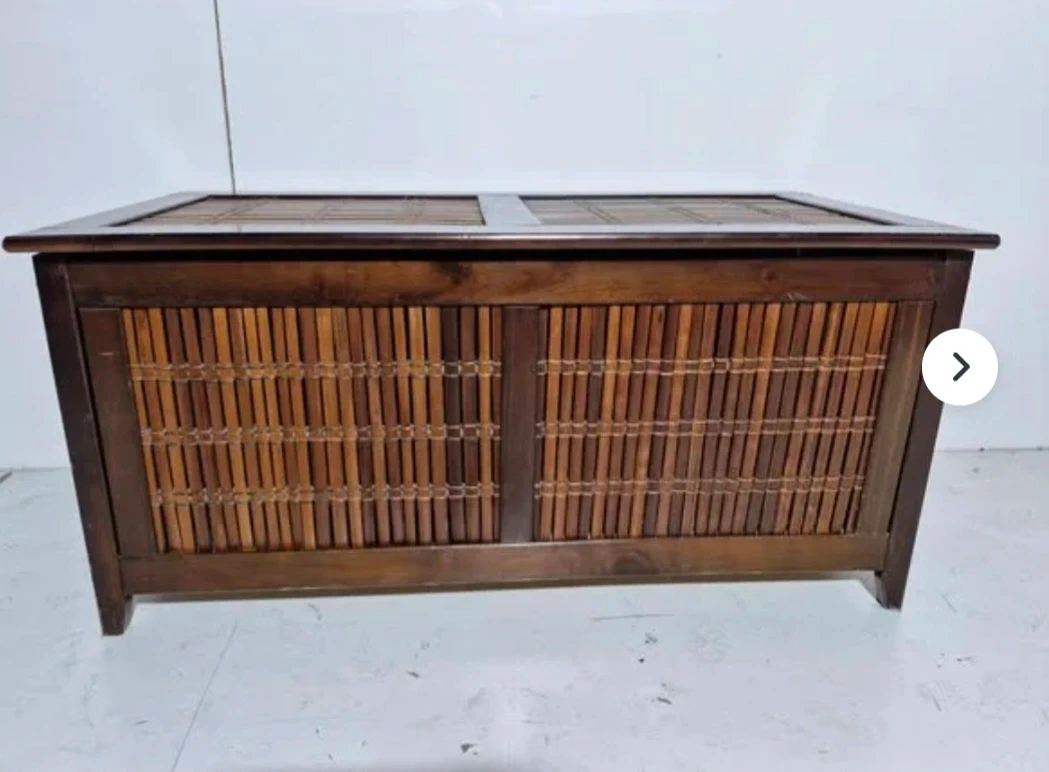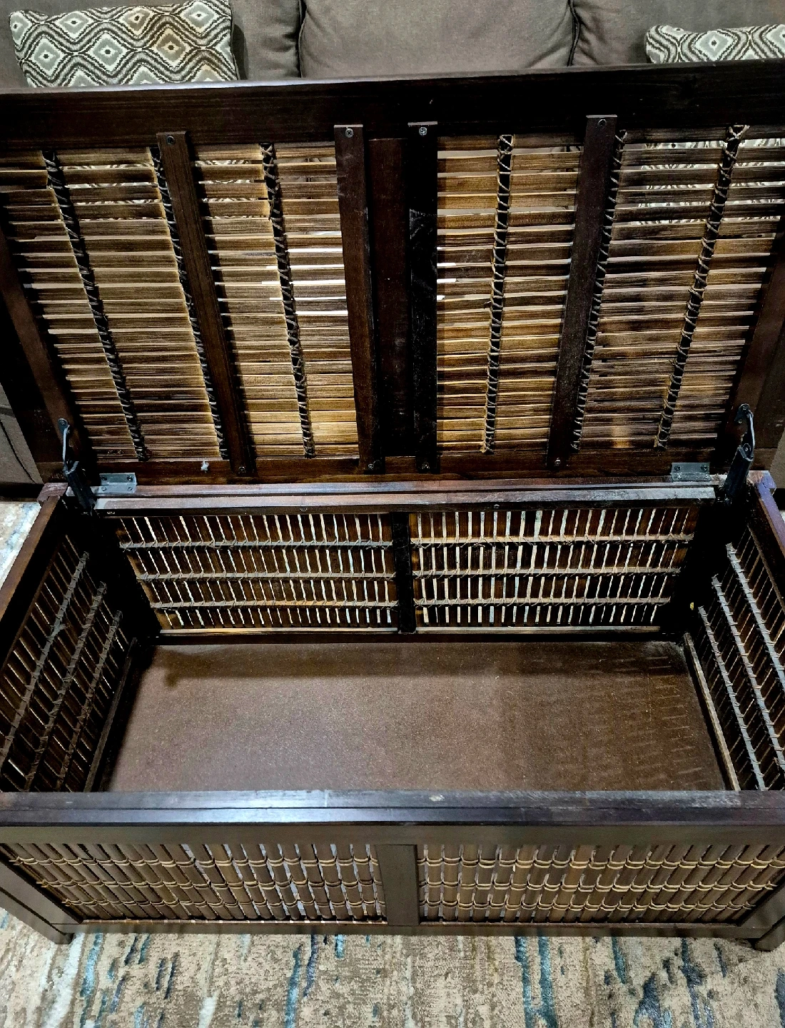 Selling a coffee table that doubles as a storage trunk! It has a unique bamboo design and a dark wood finish. The top lifts up to reveal a spacious storage area, perfect for blankets, books, or anything else you want to keep out of sight. It's in great condition and would be a stylish addition to any living room