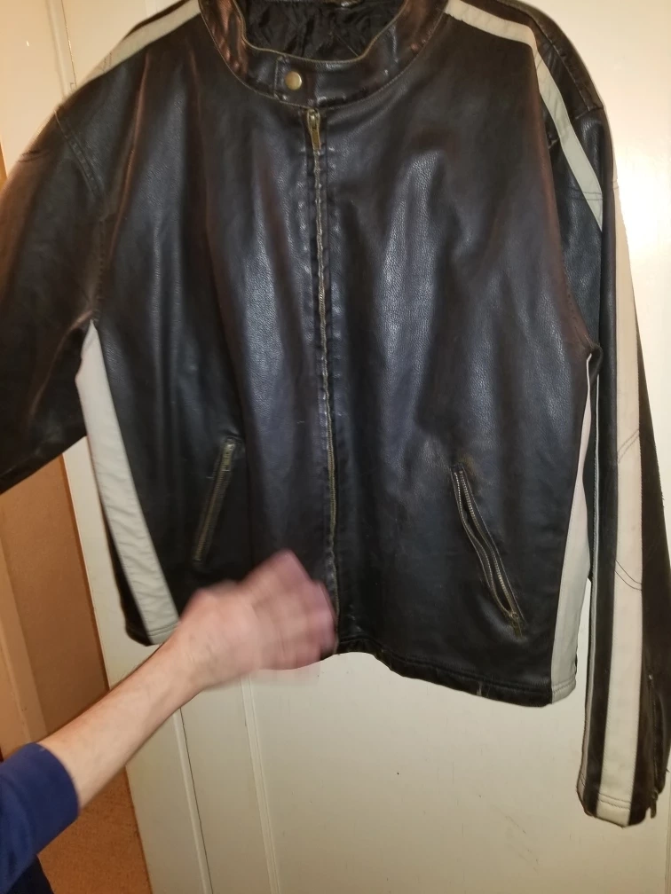 Arizona Jean Company leather jacket in good condition. The jacket features a classic design with premium denim detailing, reflecting superior quality and craftsmanship established in 1988. It's a stylish and durable piece for any wardrobe