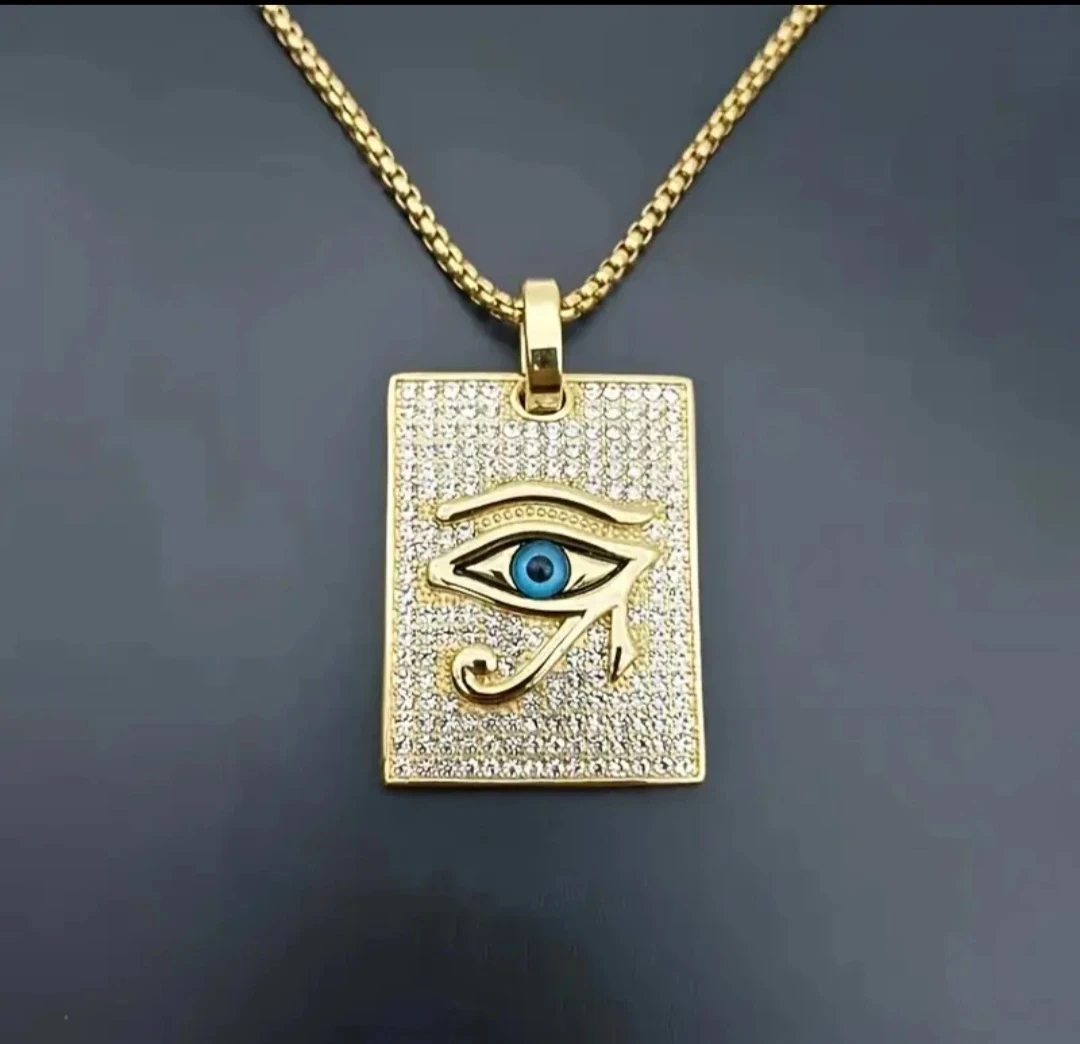 Selling a gold-tone necklace featuring an Eye of Horus pendant. The pendant is rectangular and covered in small rhinestones, with a blue stone in the eye. The chain is a matching gold colour. This is a new item