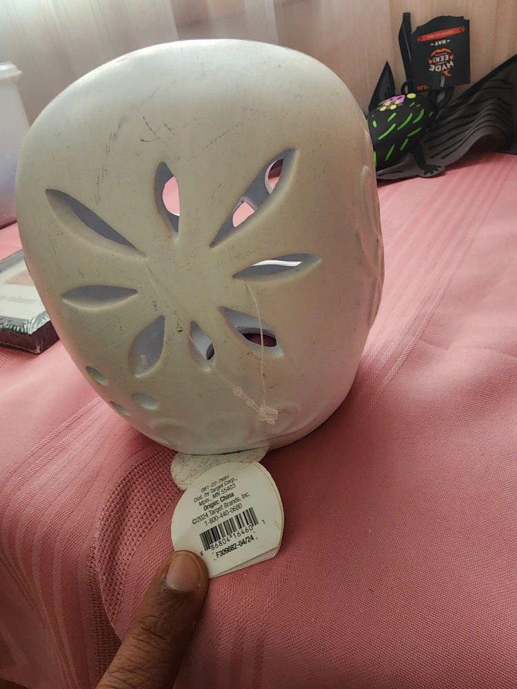 Selling a skull shaped candle holder. It's white and has some decorative cutouts. It's in good condition and would be perfect for Halloween or just to add a bit of spooky flair to your home decor