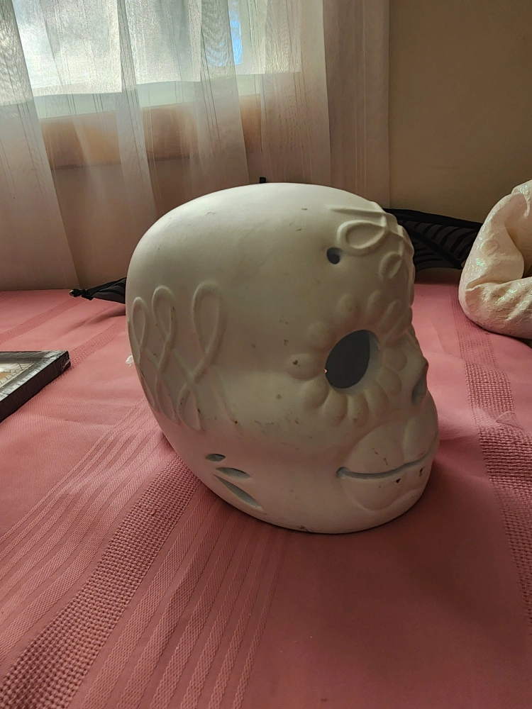 Selling a skull shaped candle holder. It's white and has some decorative cutouts. It's in good condition and would be perfect for Halloween or just to add a bit of spooky flair to your home decor