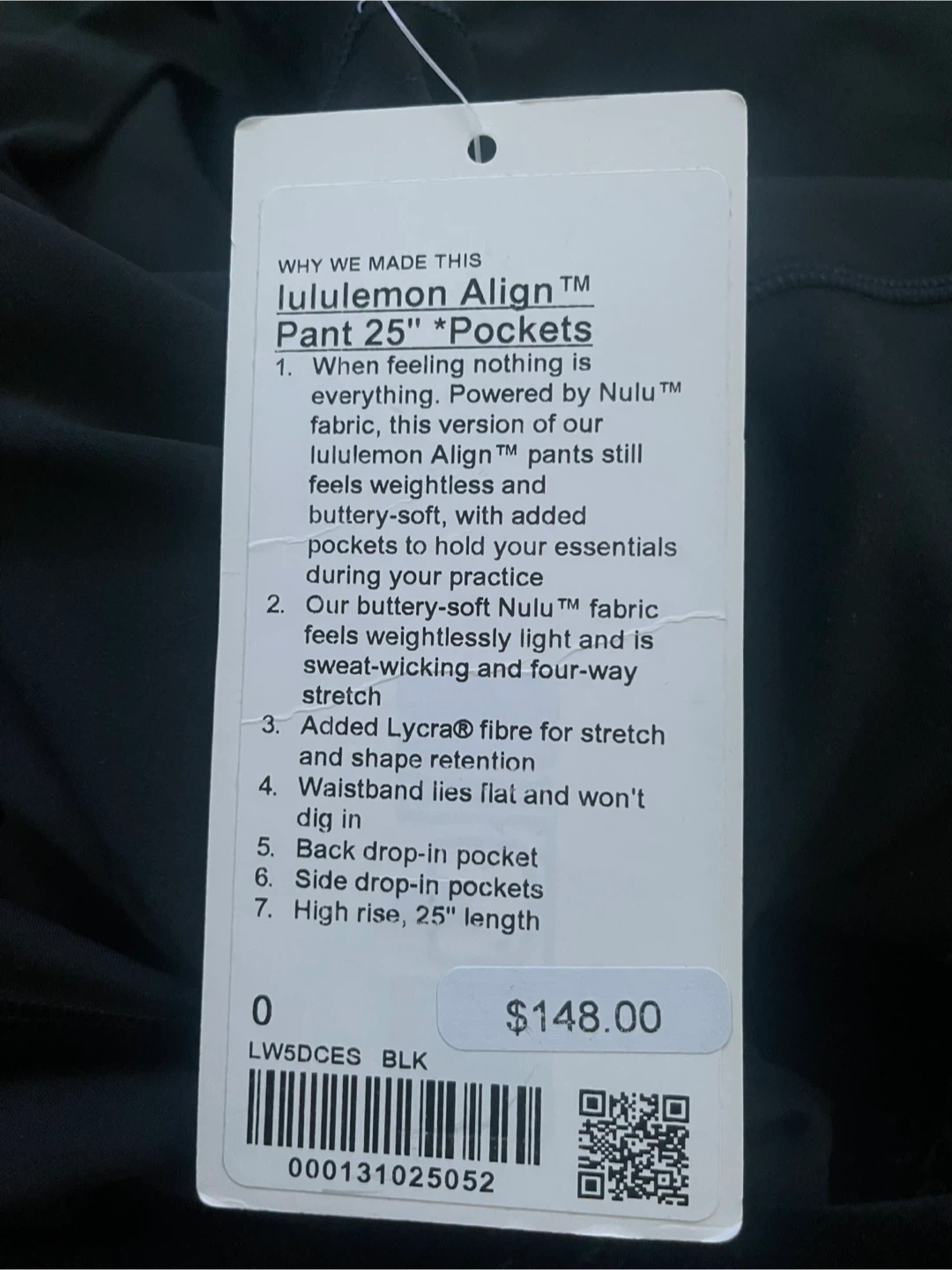 Buy & SellLululemon Align 25" Pant *Pockets - Size 0Lululemon Align 25" Pant *Pockets - Size 0$70Lululemon Align 25" Pant with Pockets in black, size 0! They also have stretch and shape retention. Originally bought for my sister for $160ConditionNewSizeSIZE 0BrandLululemon0 chats·0 favorites·56 viewsSELLERmikaSunshine Hills170 reviewsWHERE TO MEETCheck Location