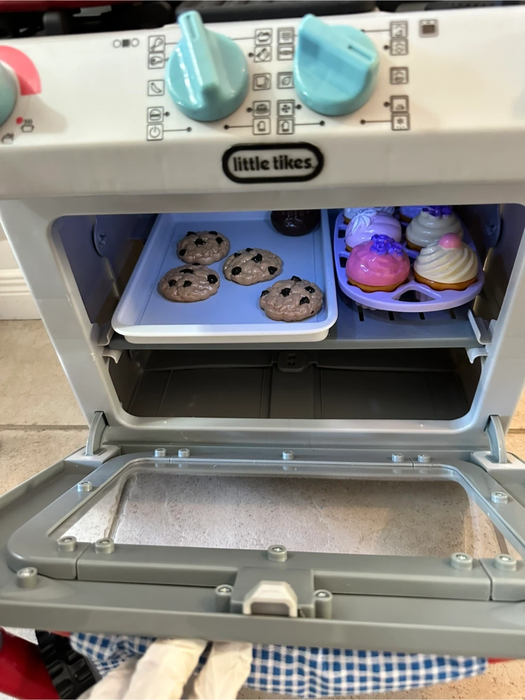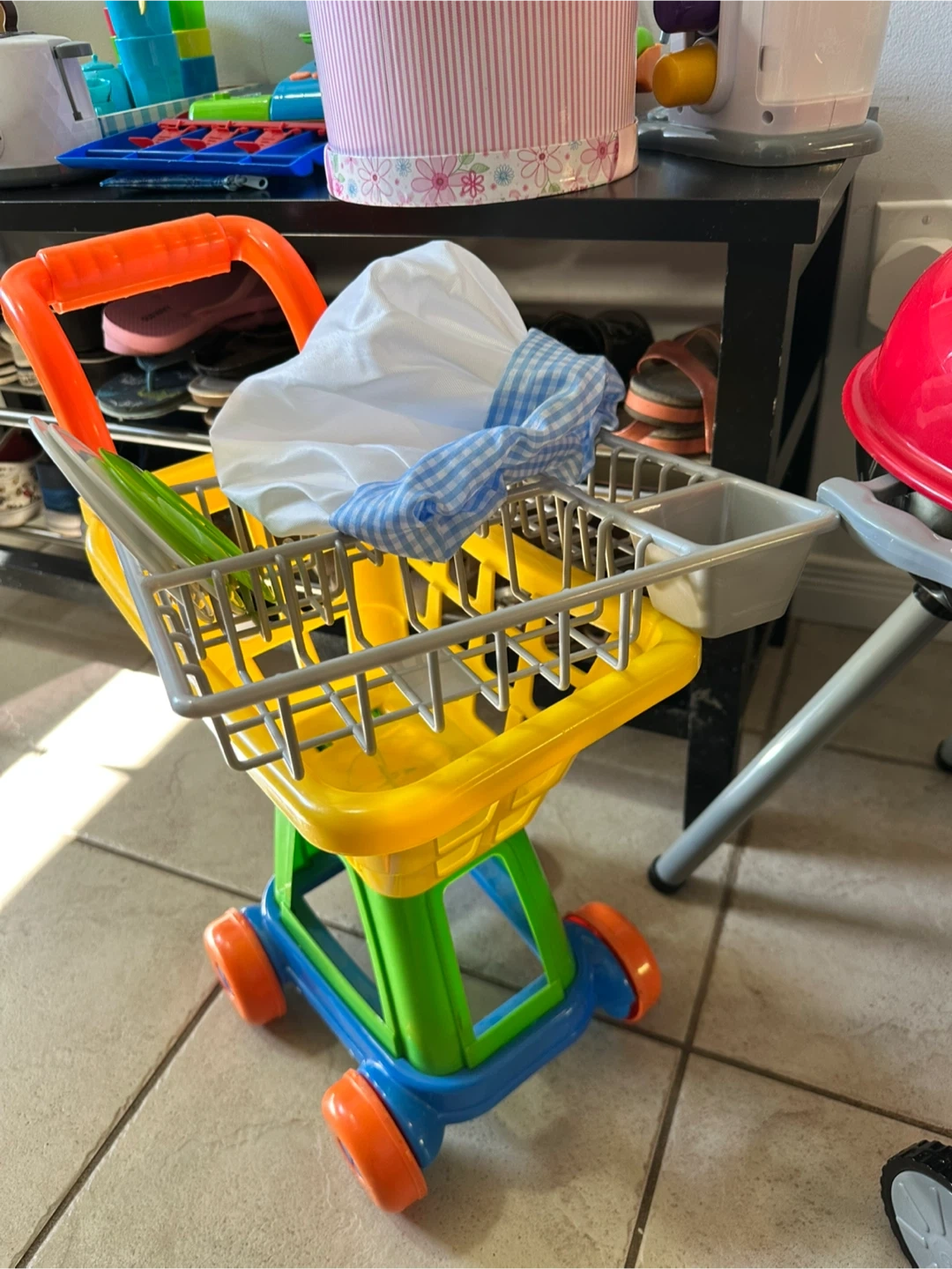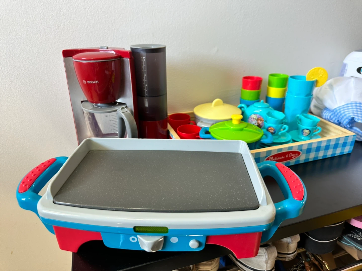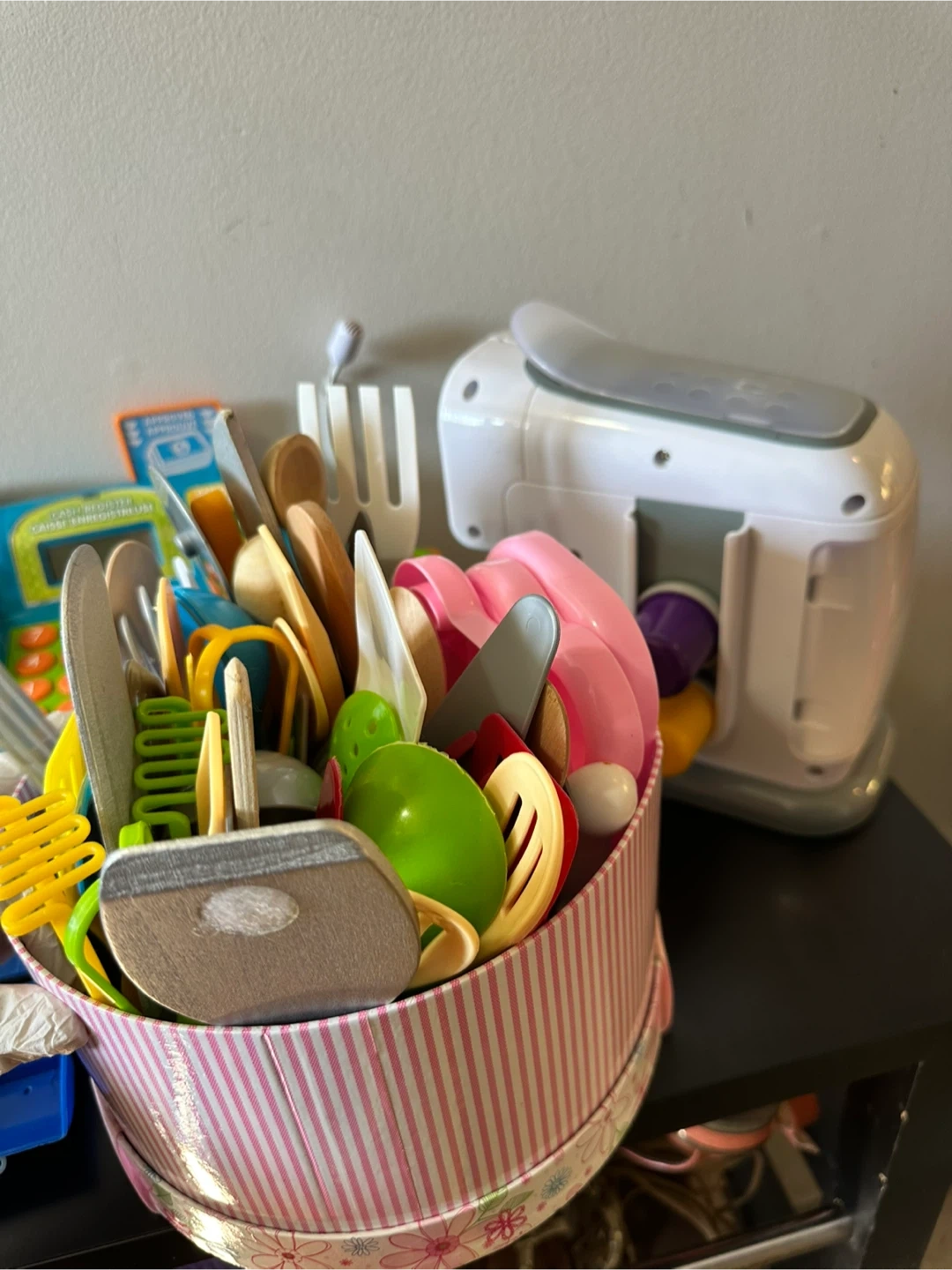 106A bunch of pretend play kitchen toys for kids! Includes a shopping cart, coffee maker, cash register, toaster, and lots of kitchen utensils. Perfect for hours of imaginative play! & there’s so much more but couldn’t add more pictures. There’s also tons of pretend food (pizzas with their toppings, tacos/wraps, veggies, fruits, all you can imagine. I’ll even add the shelf/organizer). There’s a fridge with the freezer. Stocked with “drinks”, condiments, ice creams, ice, etc. baking oven, with cupcakes & such. Sink to wash the dishes, drying wrack, etc. I’ll send more pics if you’d like to see the rest. A lot of the items run on batteries. Everything in perfect condition.