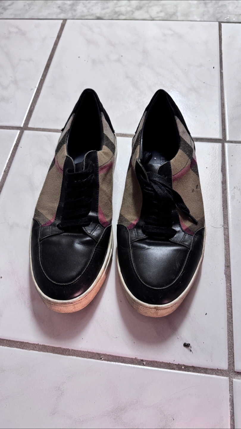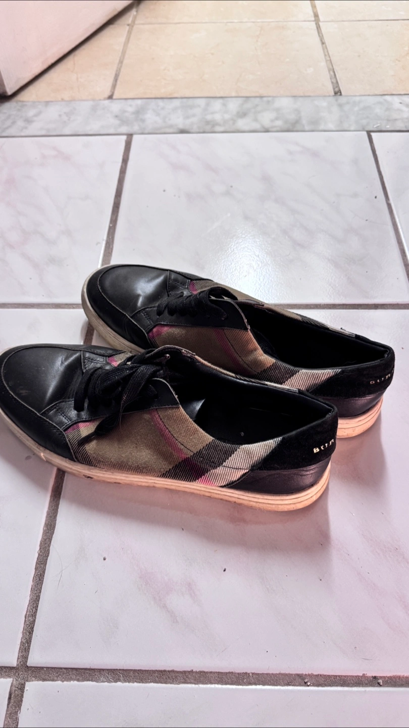 Selling a pair of Burberry leather sneakers in size 42. They feature a classic design with leather and the iconic Burberry check pattern. These sneakers are made in Italy and have a stylish, low-profile look. Perfect for casual wear!