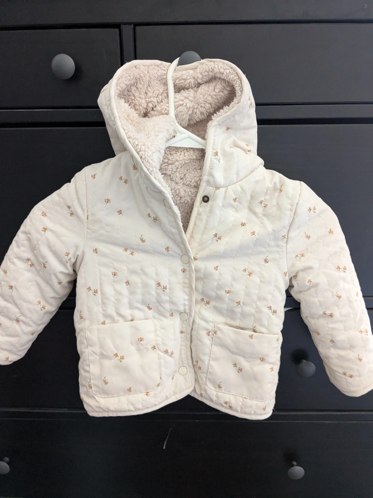 A super cute Natalys baby jacket, perfect for keeping your little one warm! It's a quilted jacket with a floral pattern and a cozy sherpa lining. Size is 24 months. It has a hood and pockets too!