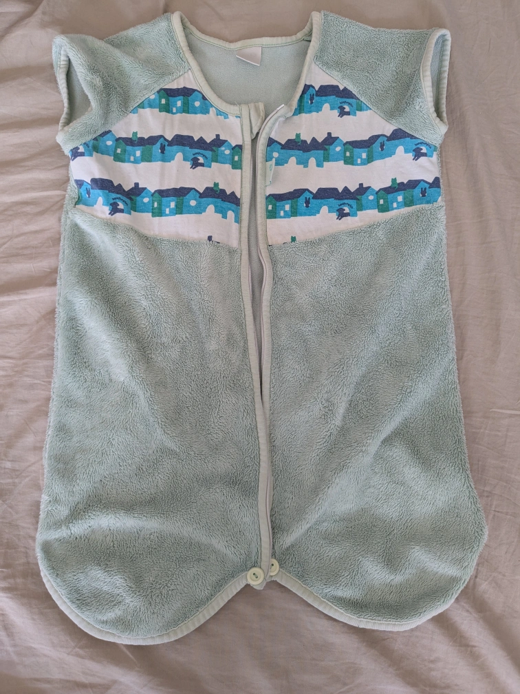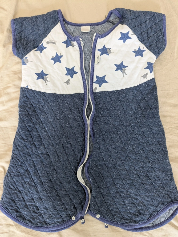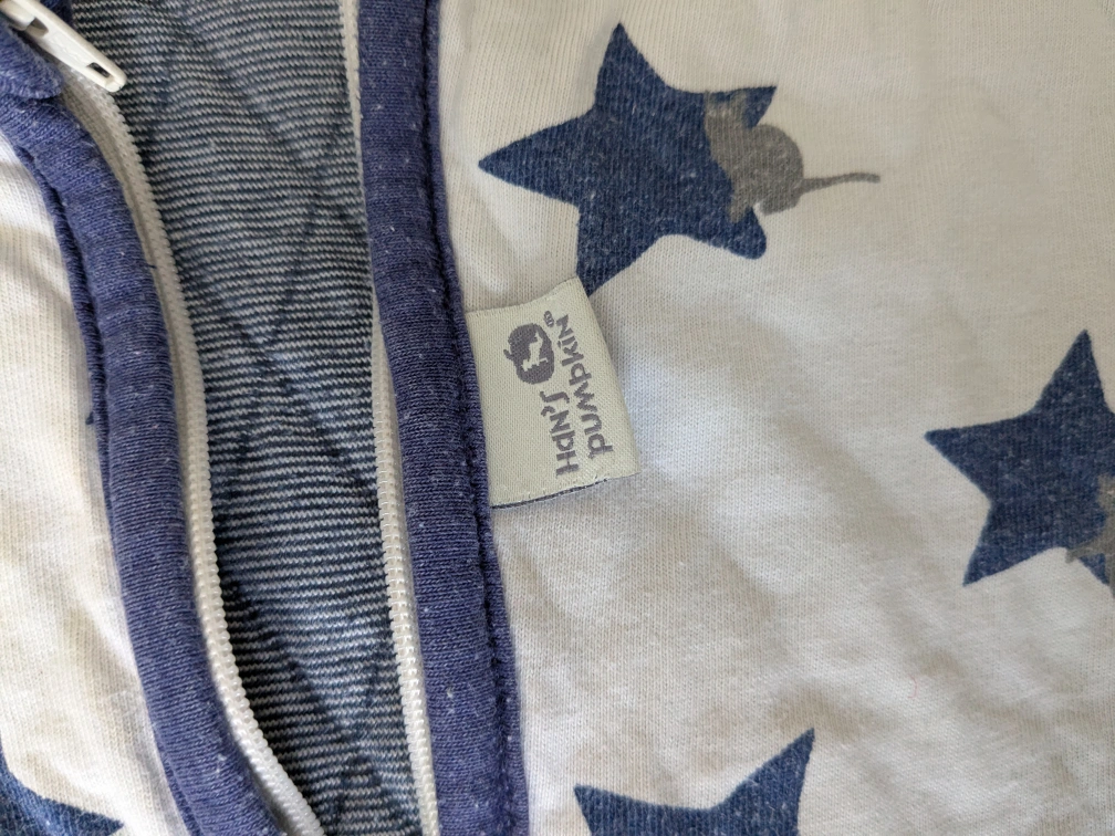 These are gently used baby sleep sacks from Han's Pumpkin! They're perfect for keeping your little one cozy and safe while they sleep. They have a zipper closure and cute designs. One is navy with stars and the other is light green with houses.
