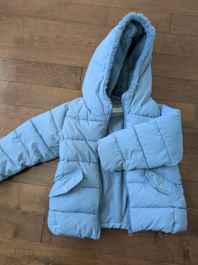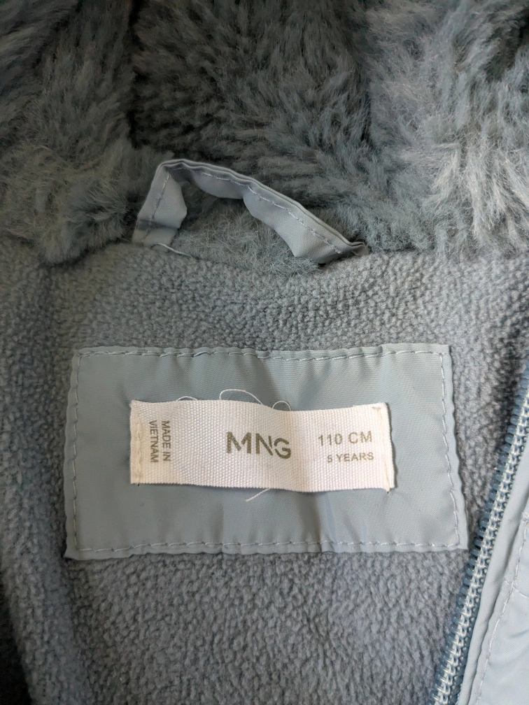 A super cute and cozy MNG puffer jacket for kids! It's a light blue colour and size 110 cm, which is suitable for around 5 years old. Perfect for keeping your little one warm during the colder months