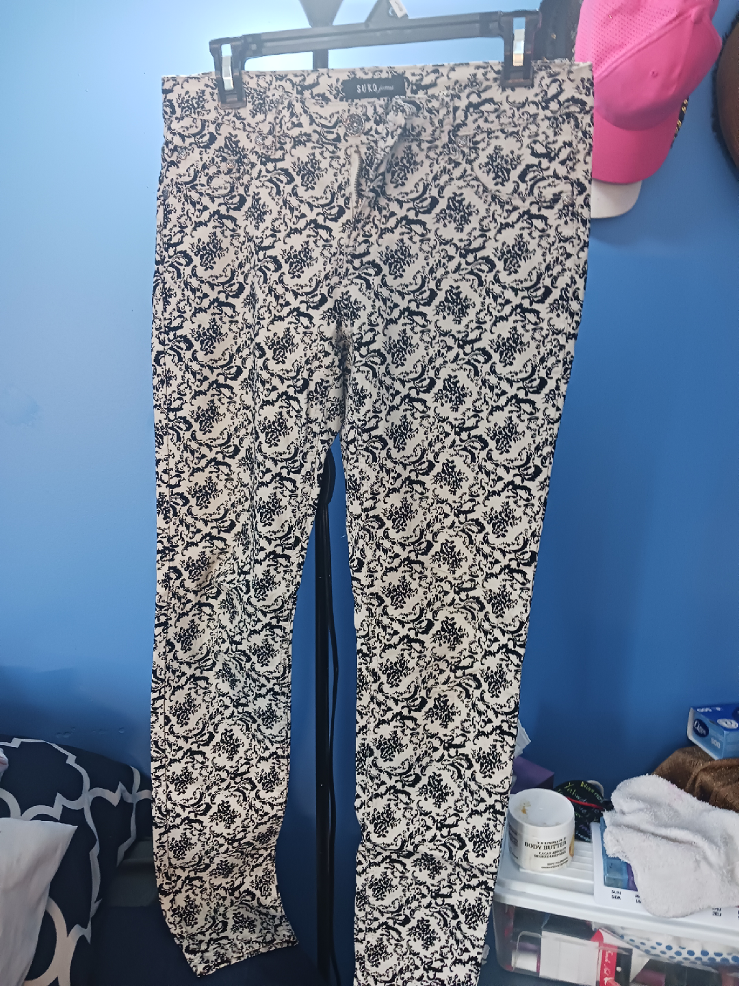 These are a pair of patterned jeans from SUKO. They're in great condition and ready for a new home! The pattern is a black and white floral design, perfect for adding a touch of style to any outfit