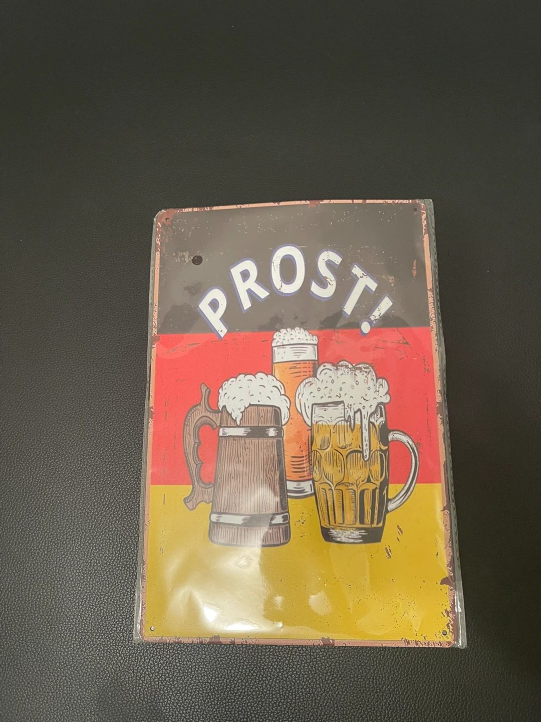 I'm selling a brand new metal sign featuring a 'Prost!' German beer design. It's still in its original packaging. Great for adding a touch of German flair to your space!