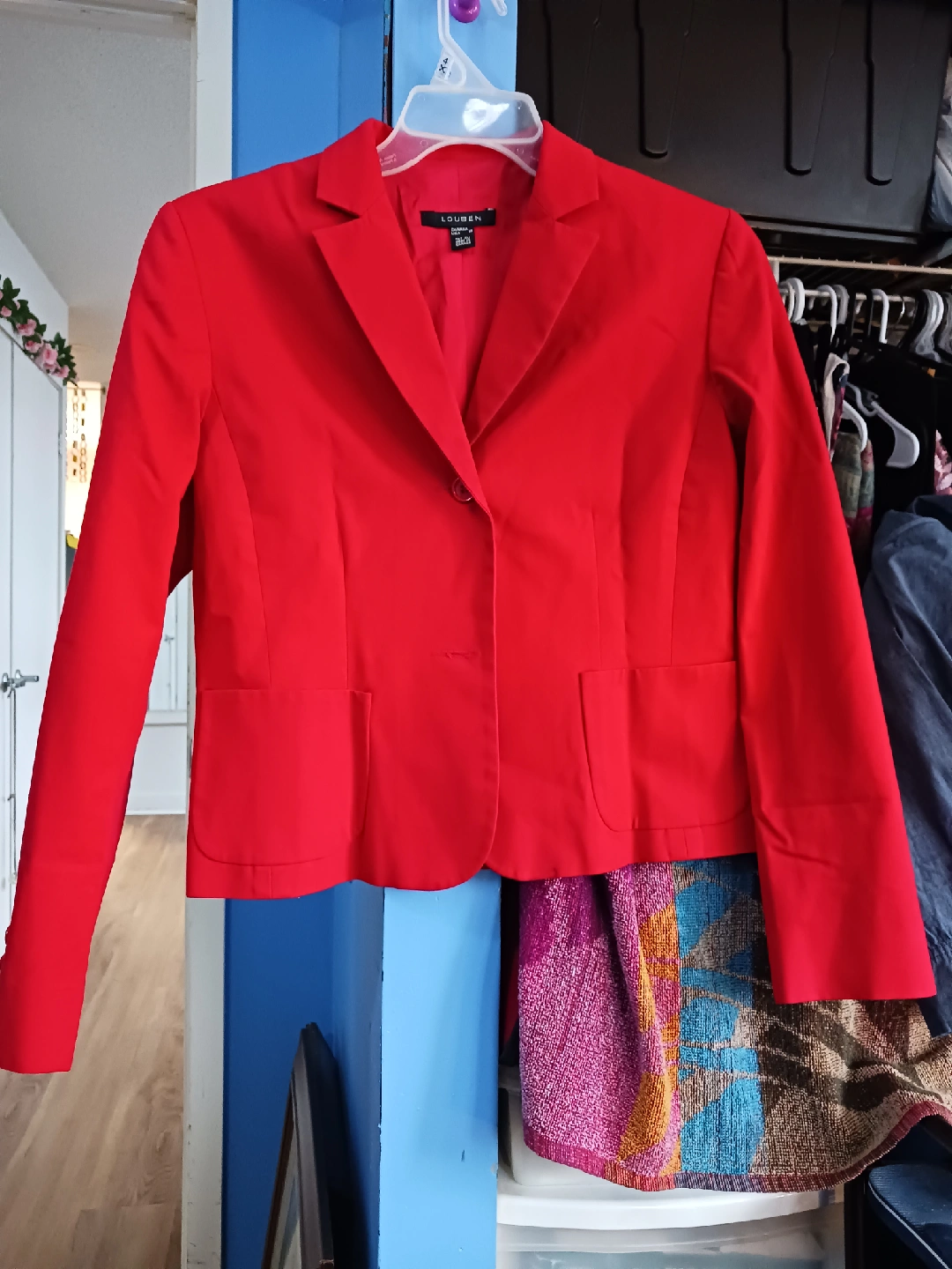 Brighten up your wardrobe with this vibrant red blazer from Louben! It's a size 10 and made in Canada. Perfect for adding a pop of colour to any outfit