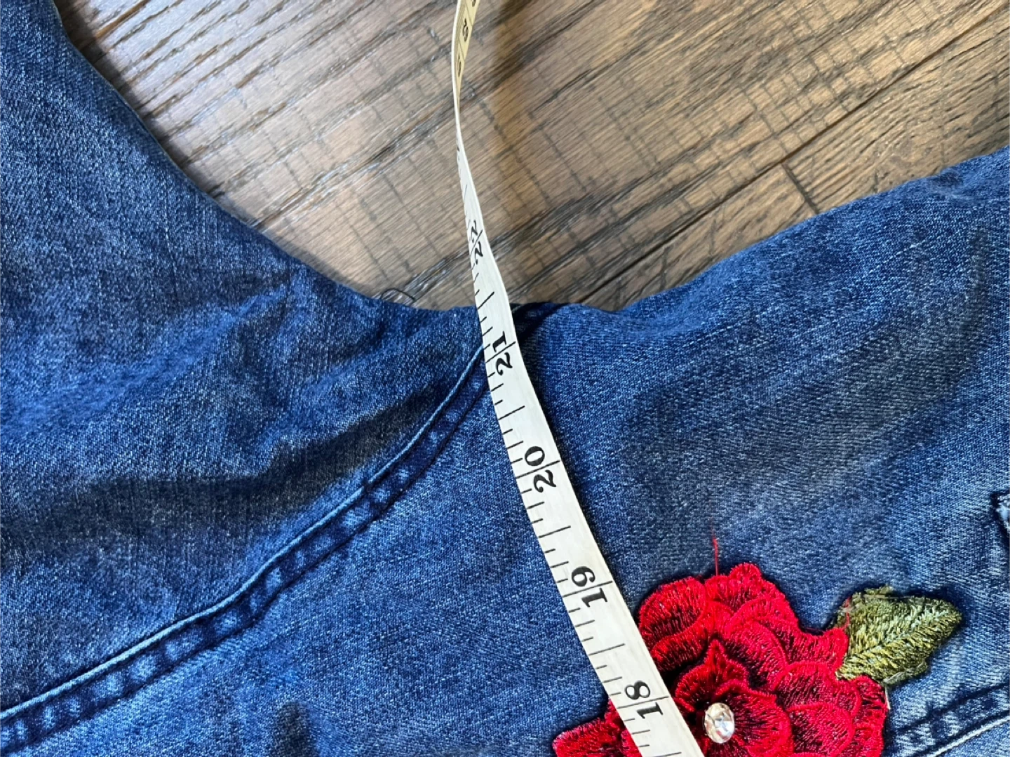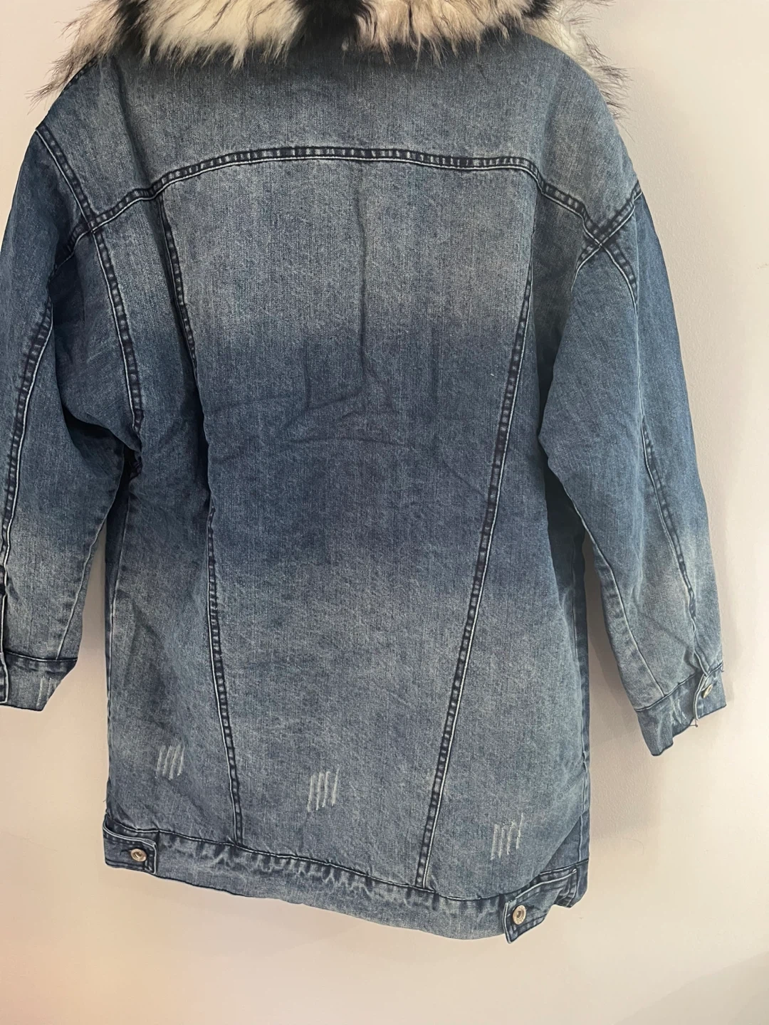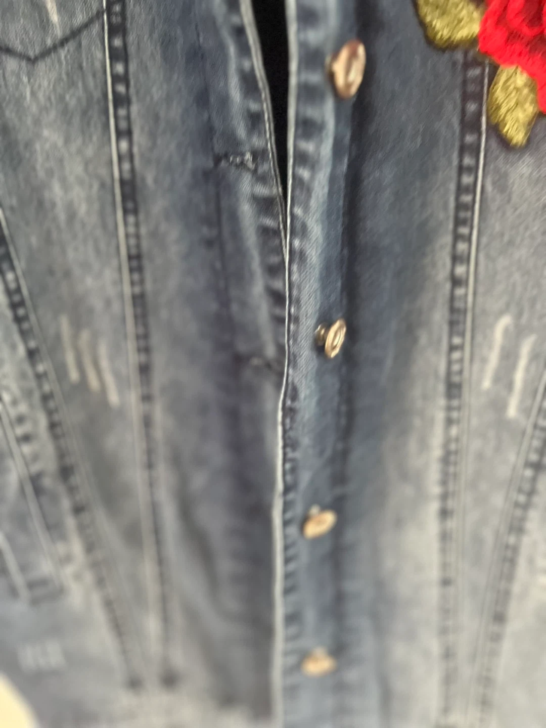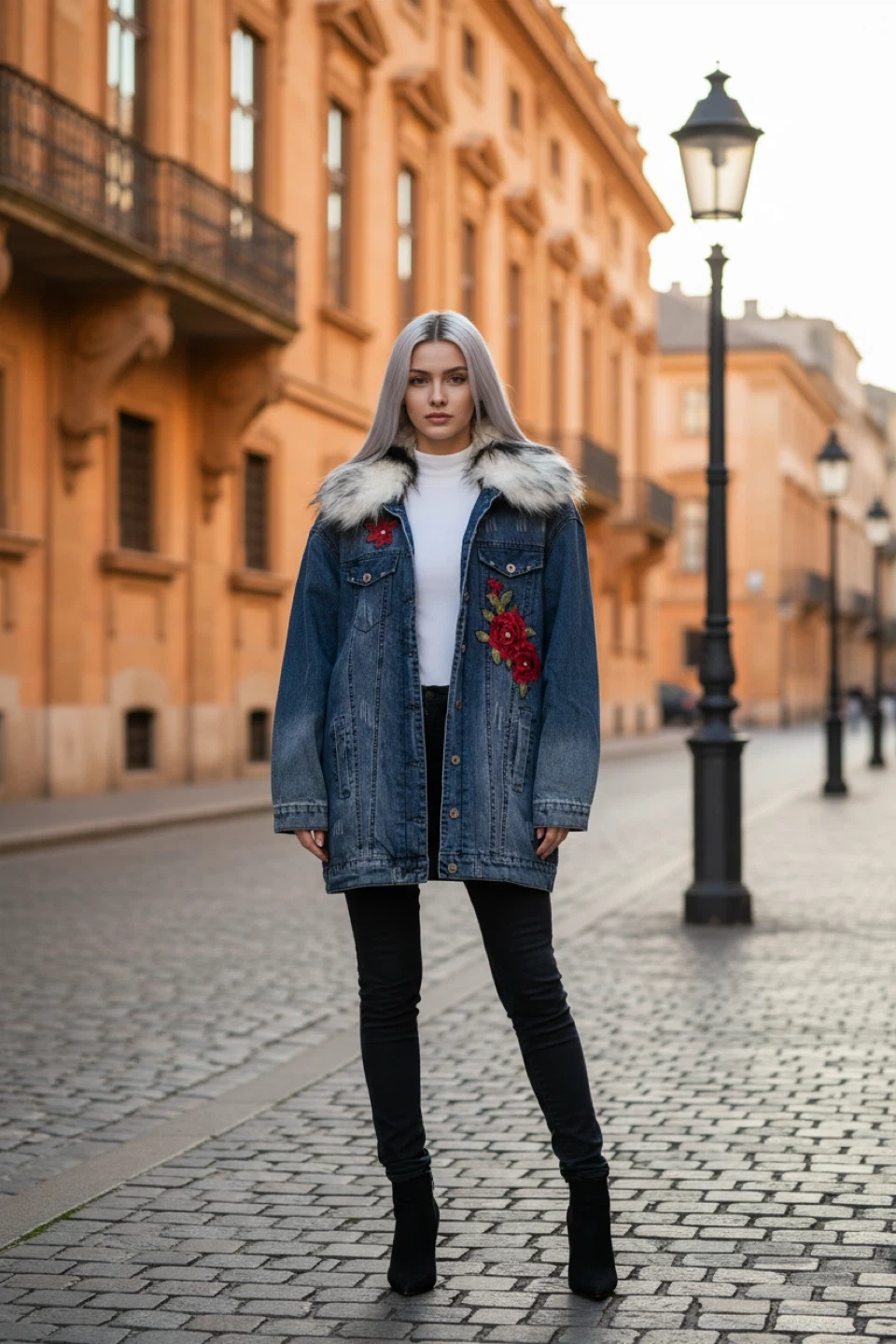 Looking to pass along this stylish denim jacket! It features a cozy faux fur collar and lovely rose embroidery details, perfect for adding a touch of flair to your wardrobe. Great quality product from Europe