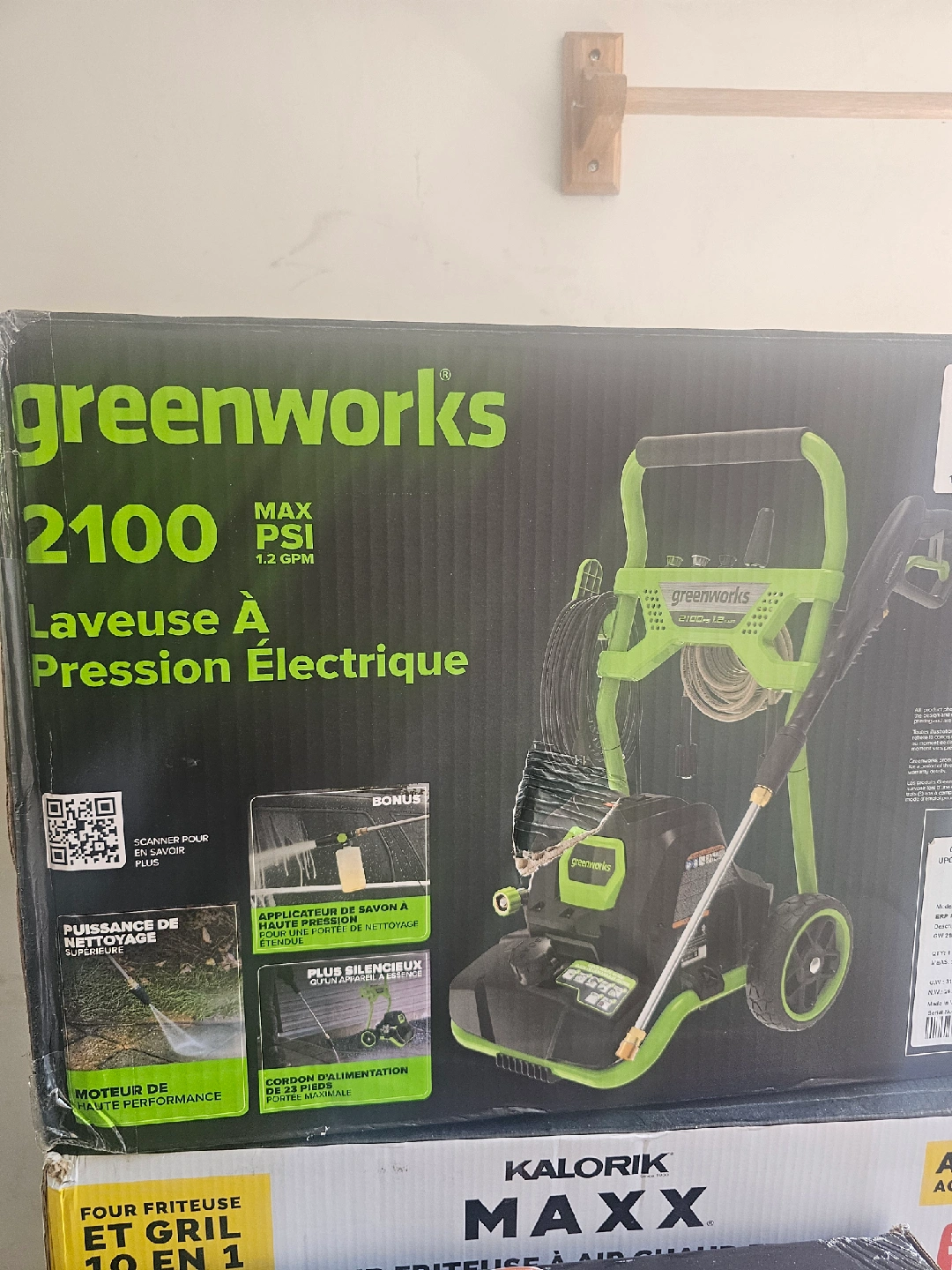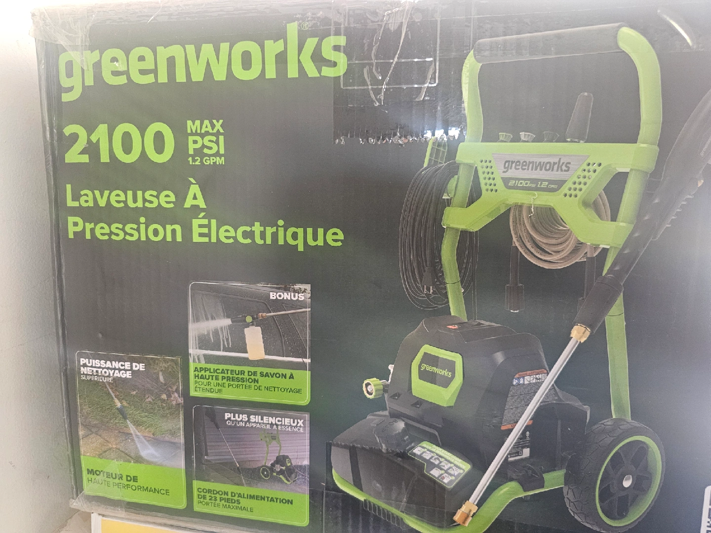 Selling a brand new Greenworks 2100 PSI electric pressure washer! It's still in its original packaging and ready to tackle any cleaning job. Features include: