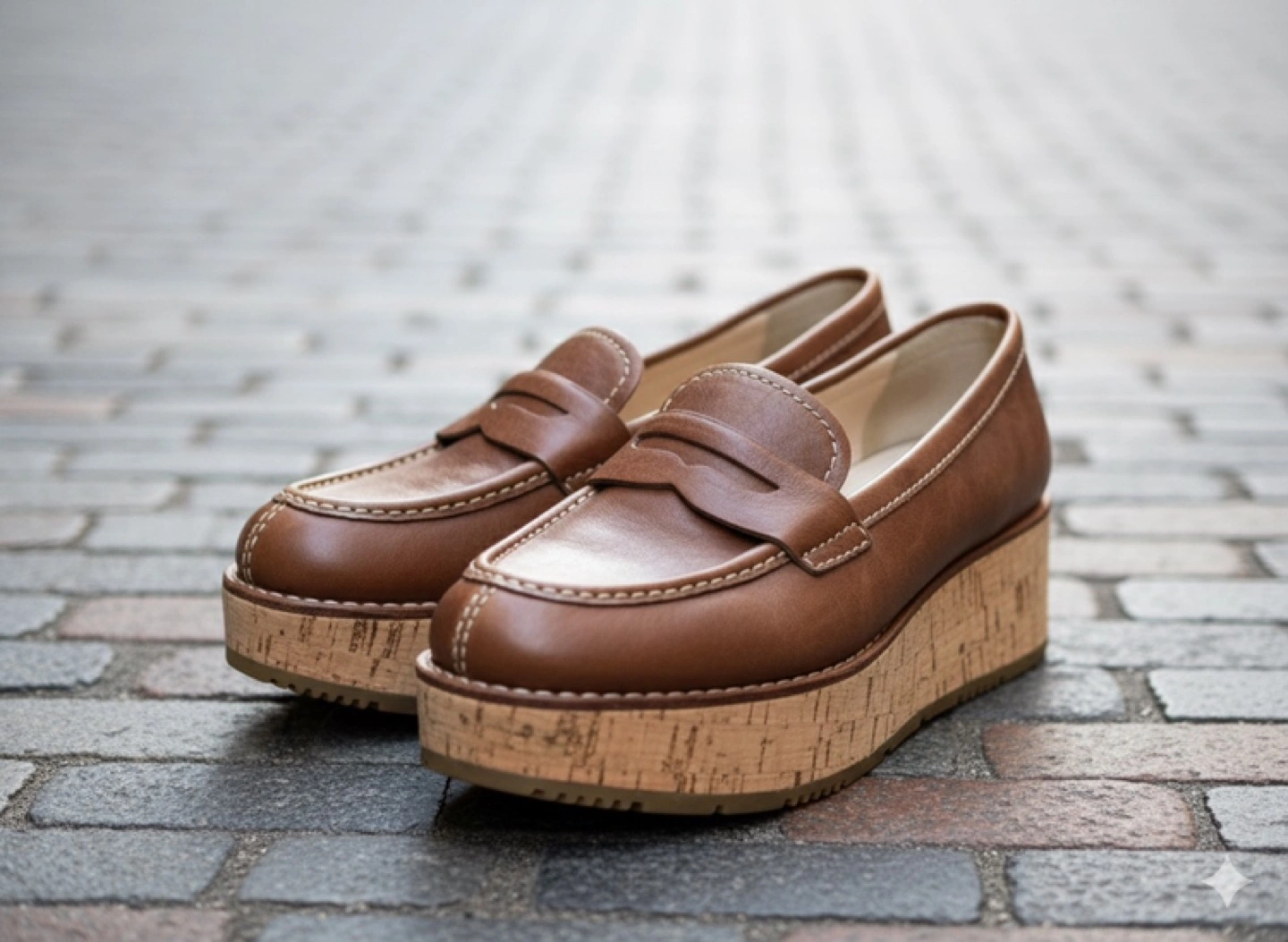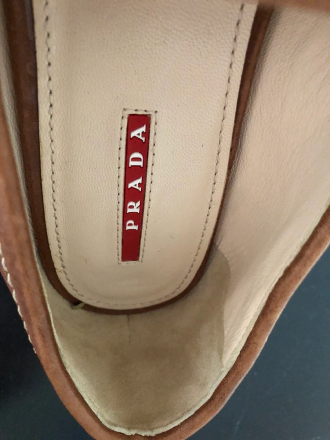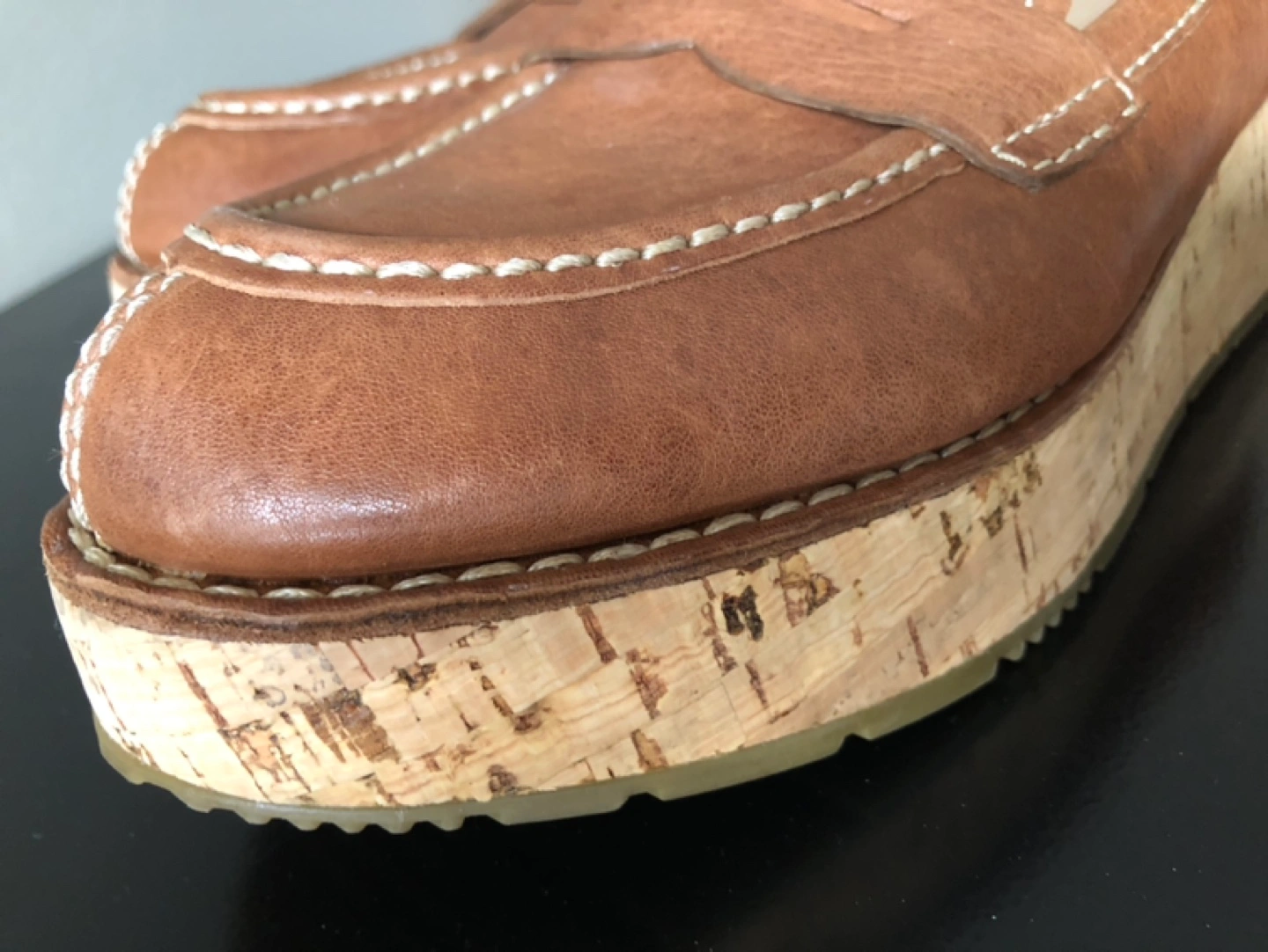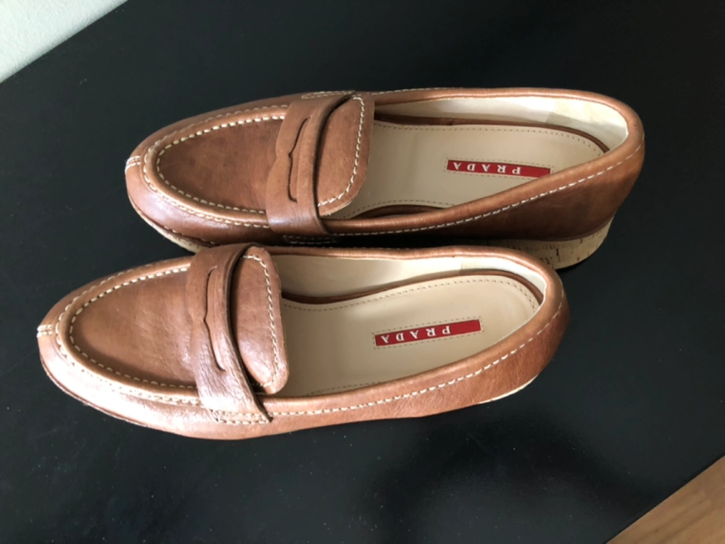 Selling a pair of Prada platform loafers in brown leather! These shoes feature a unique cork platform and lug sole. Perfect blend of a classic leather penny loafer in a warm, cognac hue, and a bold 90ies inspired chunky platform sole.