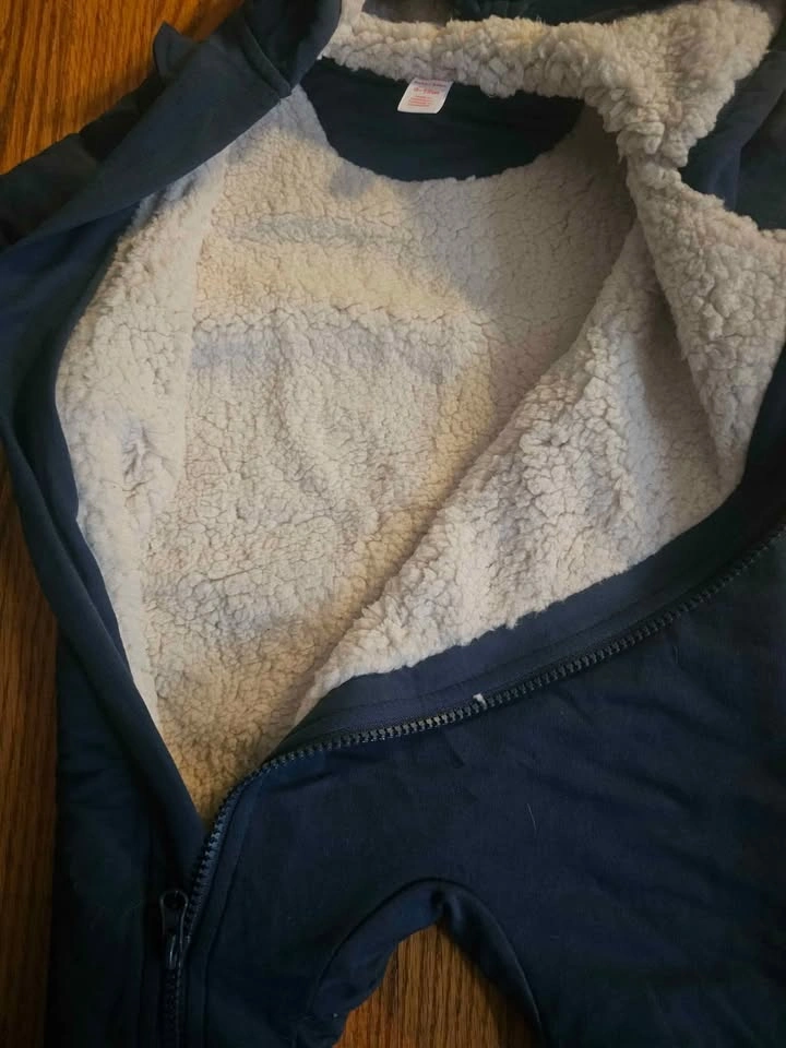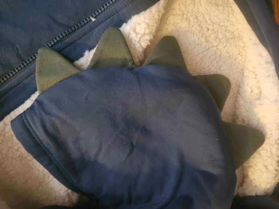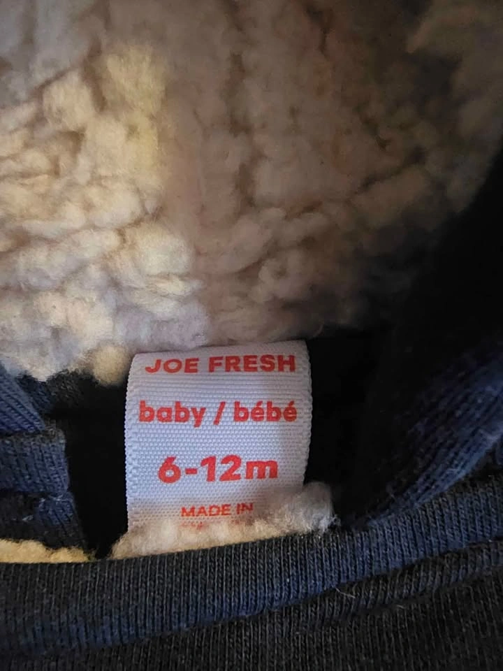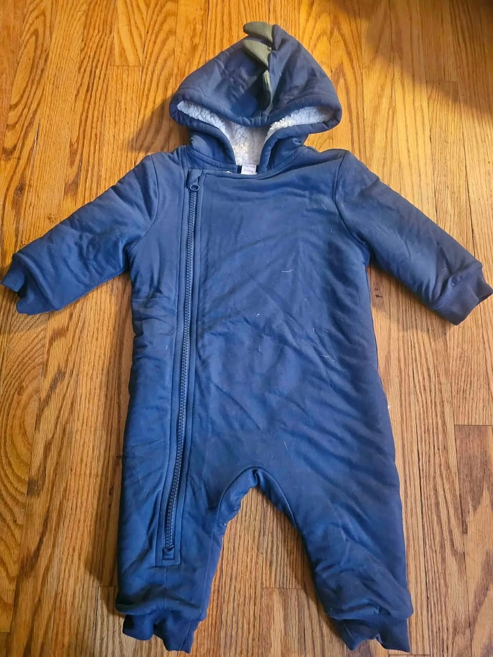 Joe Fresh Brand, Size 6m to 12m. Openings at each limb making the suit rollable and more fitting. This also allows for boots and gloves to be put on. Warm sherpa material all throughout inside. Dinosaur hood turn your kid or baby into a blue dino. Perfect for a Halloween costume option. Pickup pondmills.