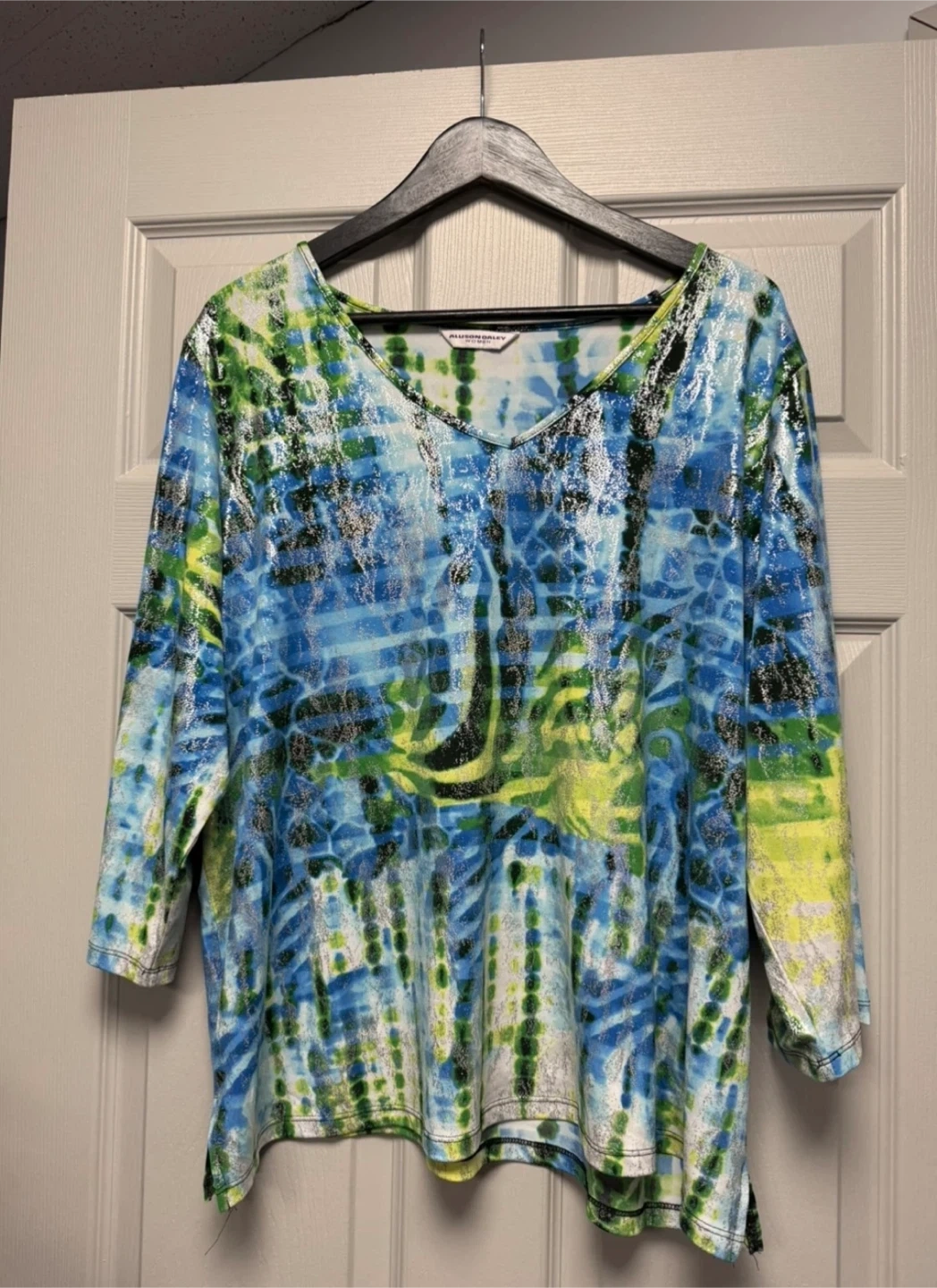 Here's a colourful Alison Daley women's top! The shirt has a blue, green, and white pattern. It's in great condition and ready for a new home