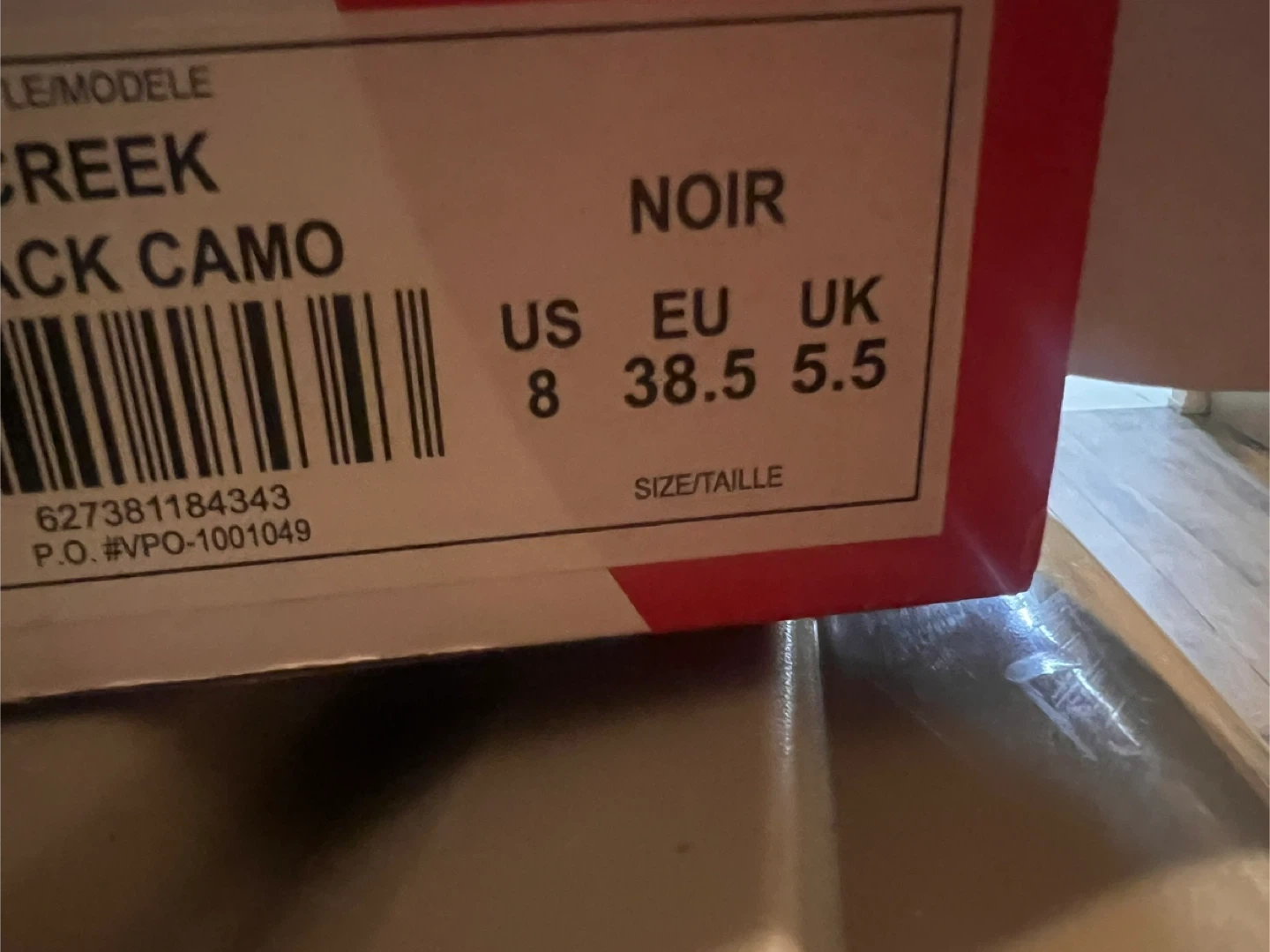 12Selling a pair of Cougar Creek winter boots in black camo, size 8. They come in the original box and are in great condition! Perfect for keeping your feet warm and dry this winter season