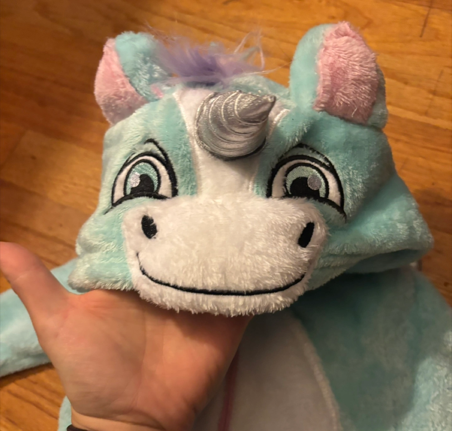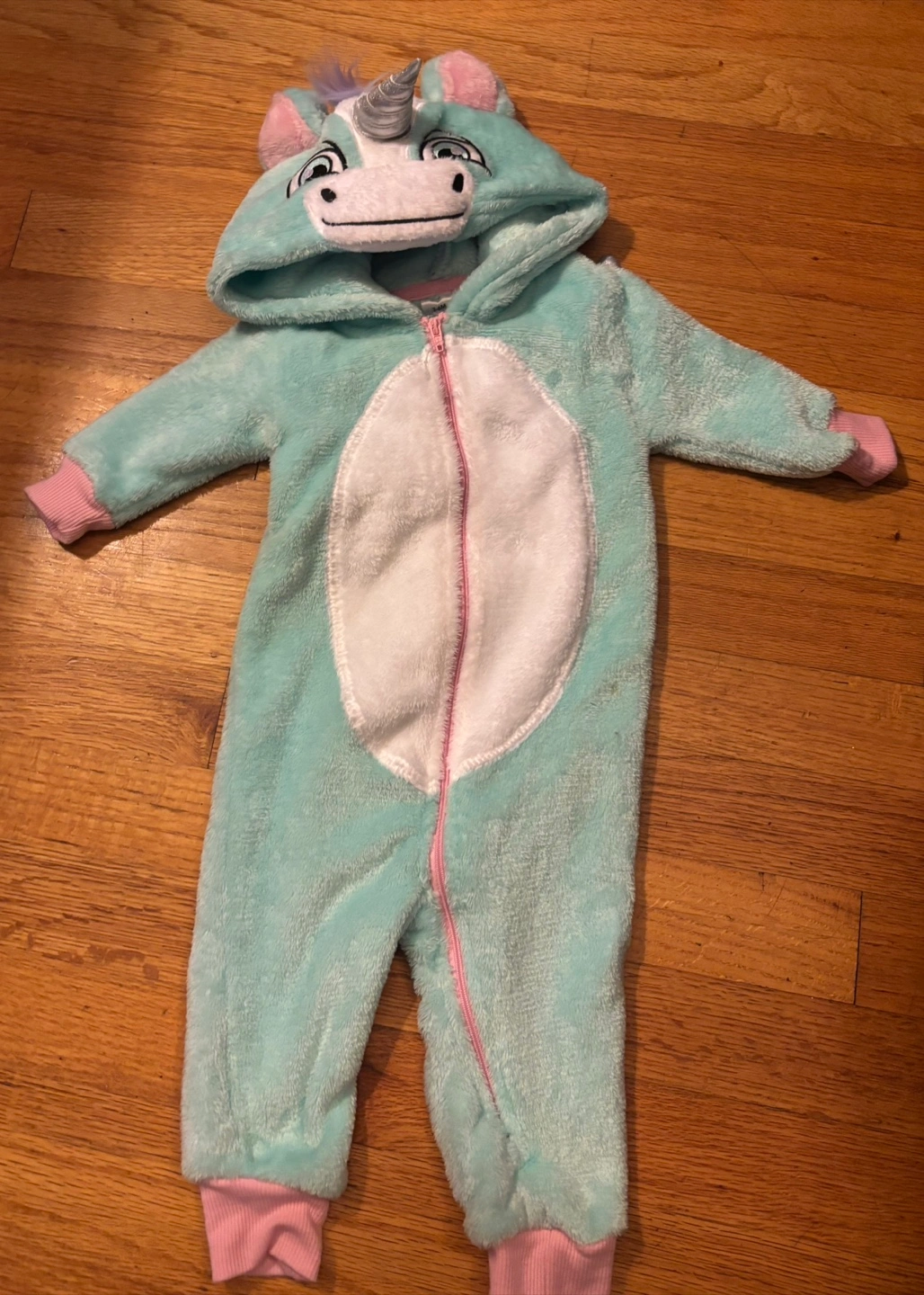 Super cute unicorn onesie from George in size 3-6M! It's a soft, plush material and features a hood with a unicorn face and a zipper down the front. Perfect for keeping your little one cozy!