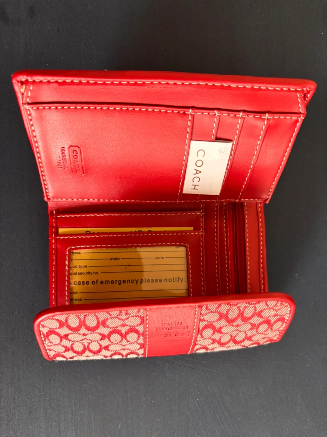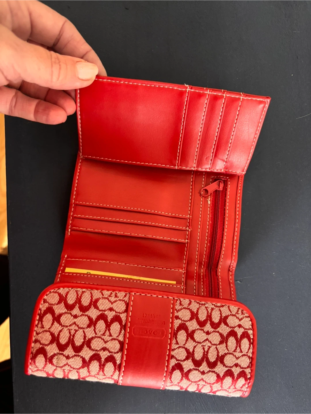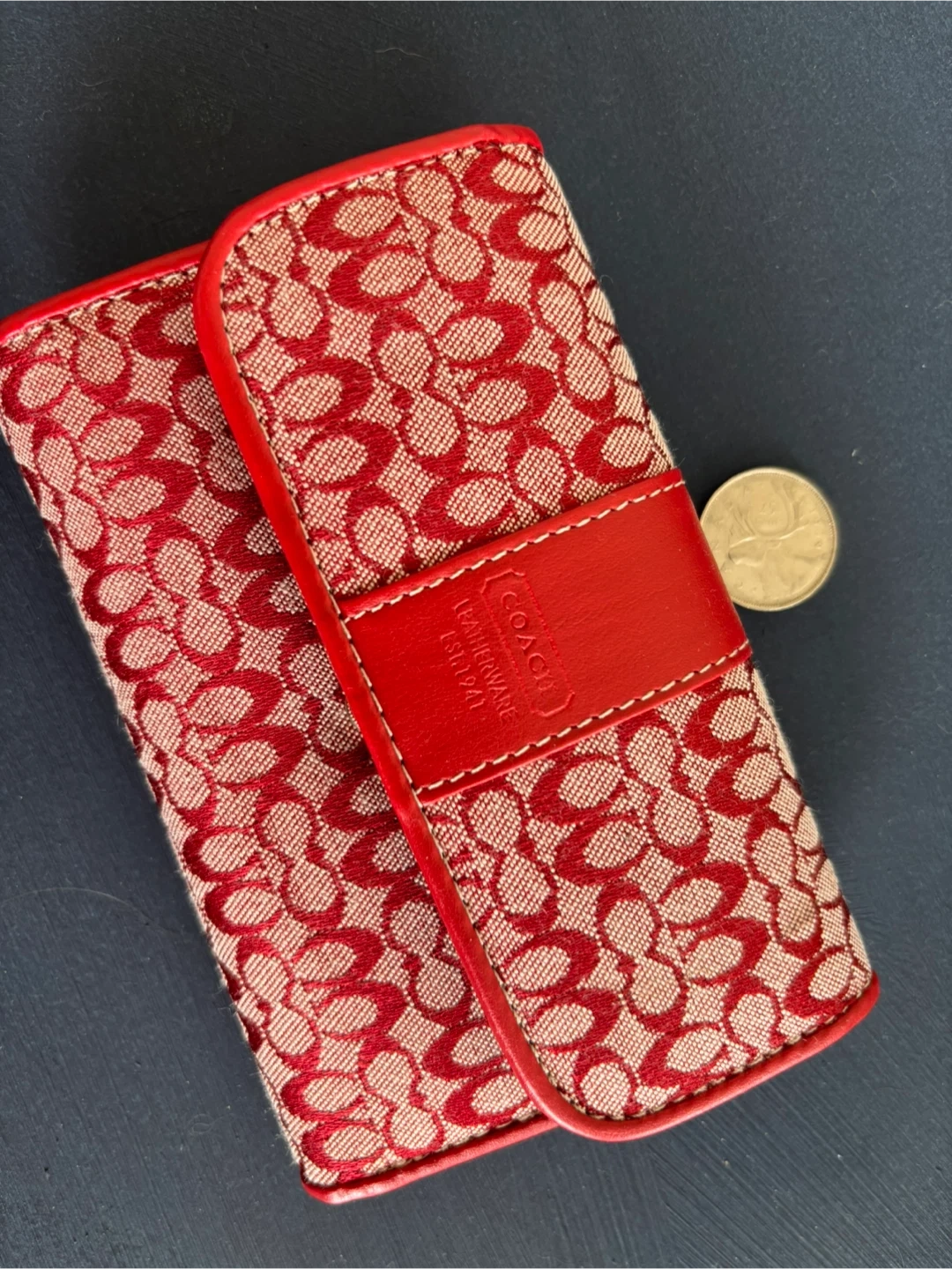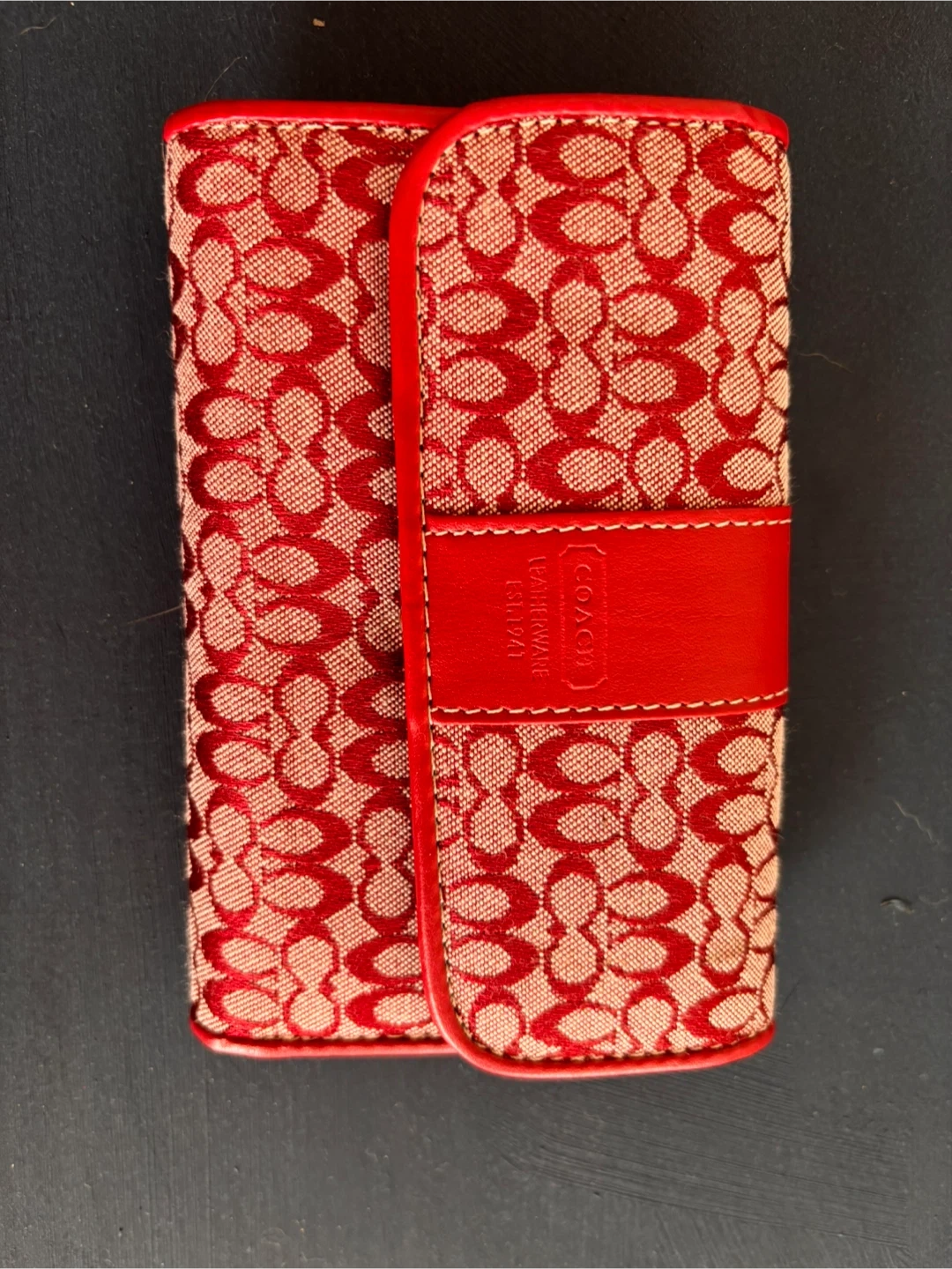 Selling a cute Coach tri-fold wallet! It features the signature Coach pattern in red and beige, with red leather trim. It has plenty of space for cards, cash, and even a little zippered compartment for coins. Perfect for everyday use!