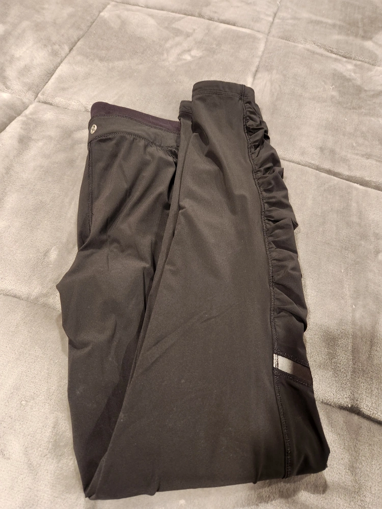 Selling a pair of Lululemon leggings in black! They feature a ruched detailing down the side of the legs. Perfect for workouts or just lounging around