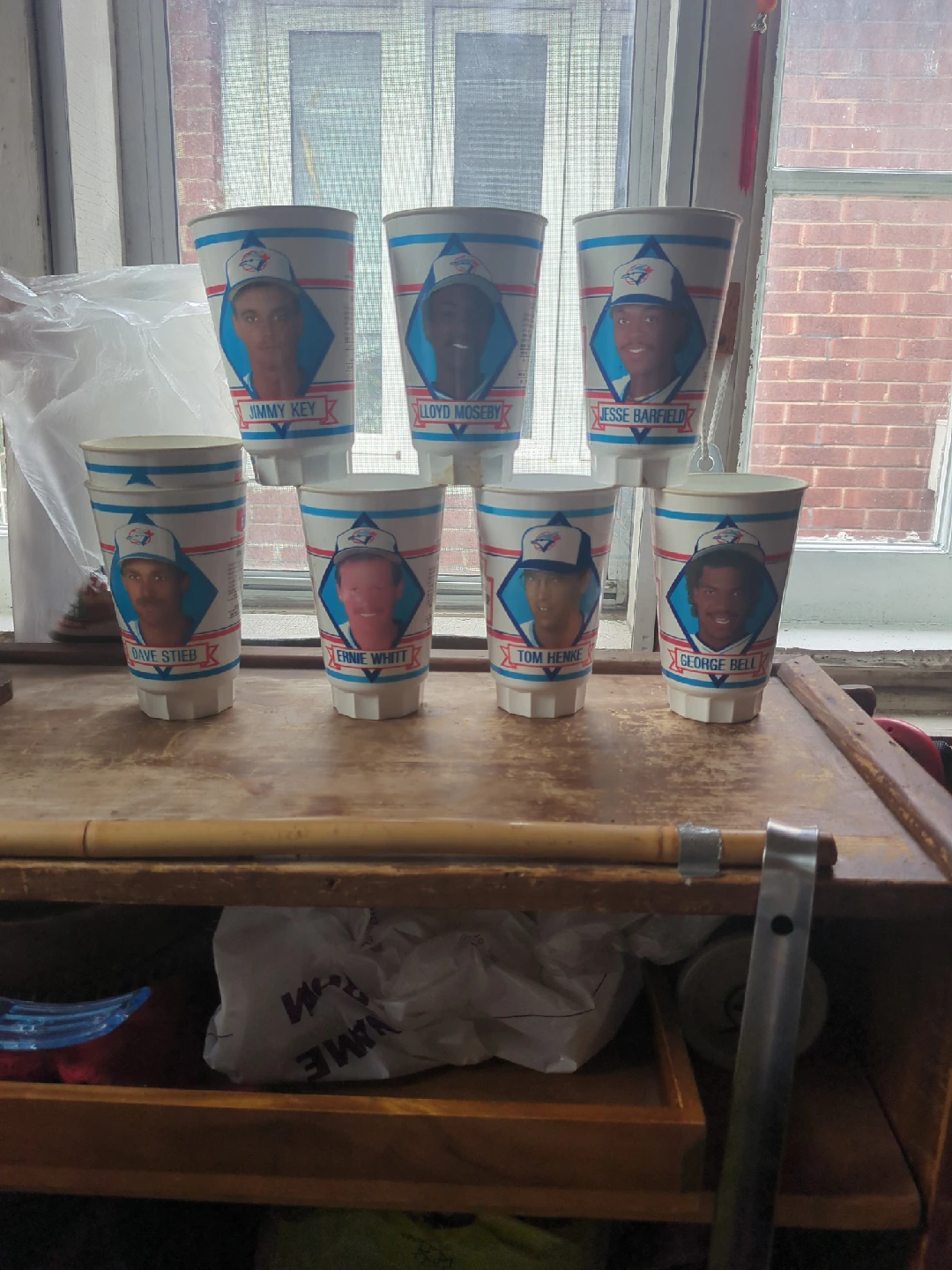 Selling a set of vintage Toronto Blue Jays cups featuring players like Jimmy Key, Lloyd Moseby, Jesse Barfield, Dave Stieb, Ernie Whitt, Tom Henke, and George Bell. Perfect for any Blue Jays fan or collector!