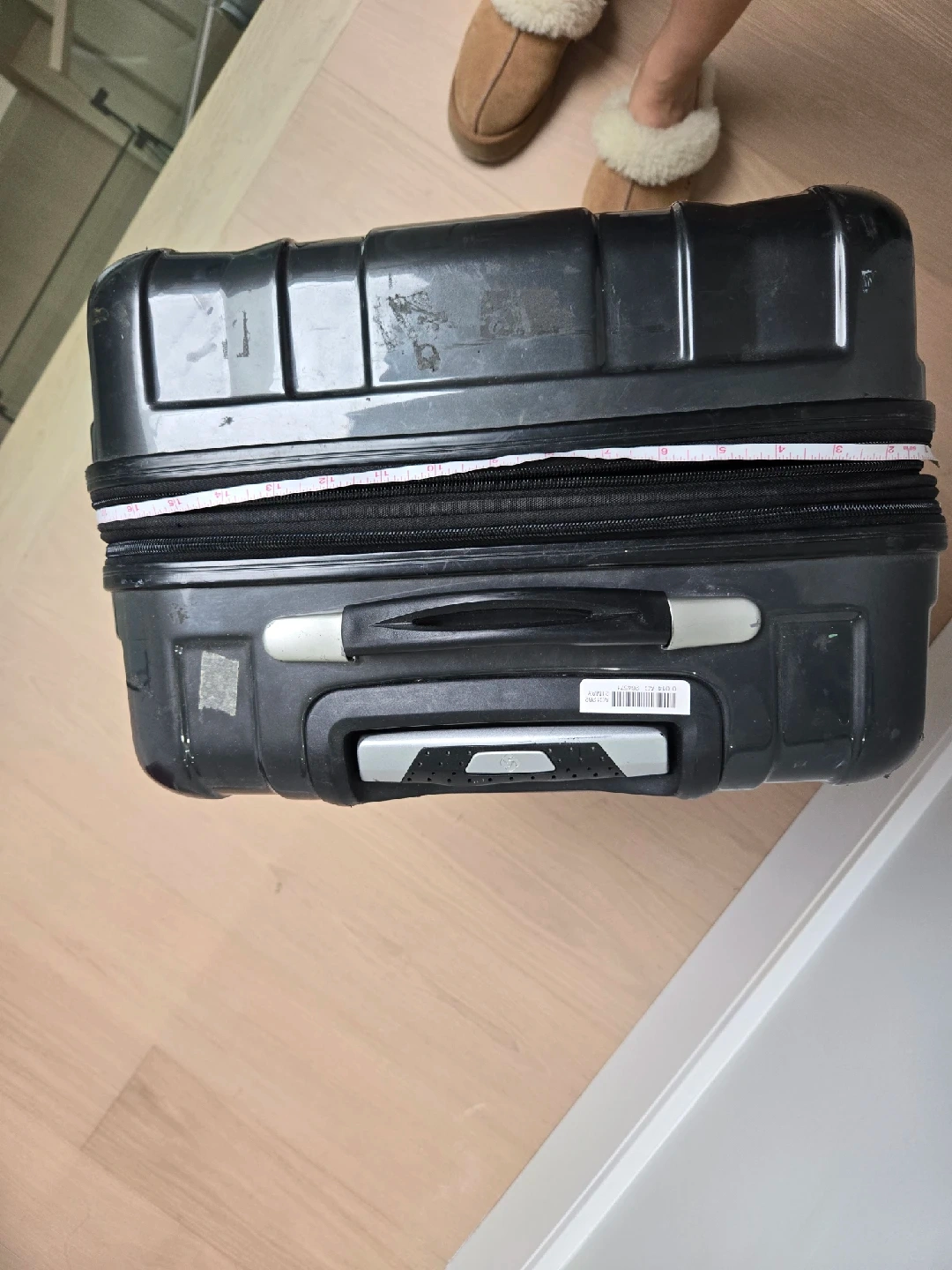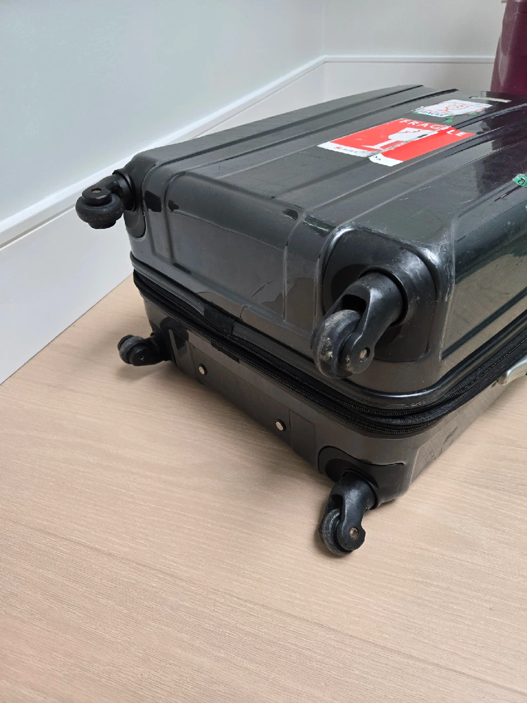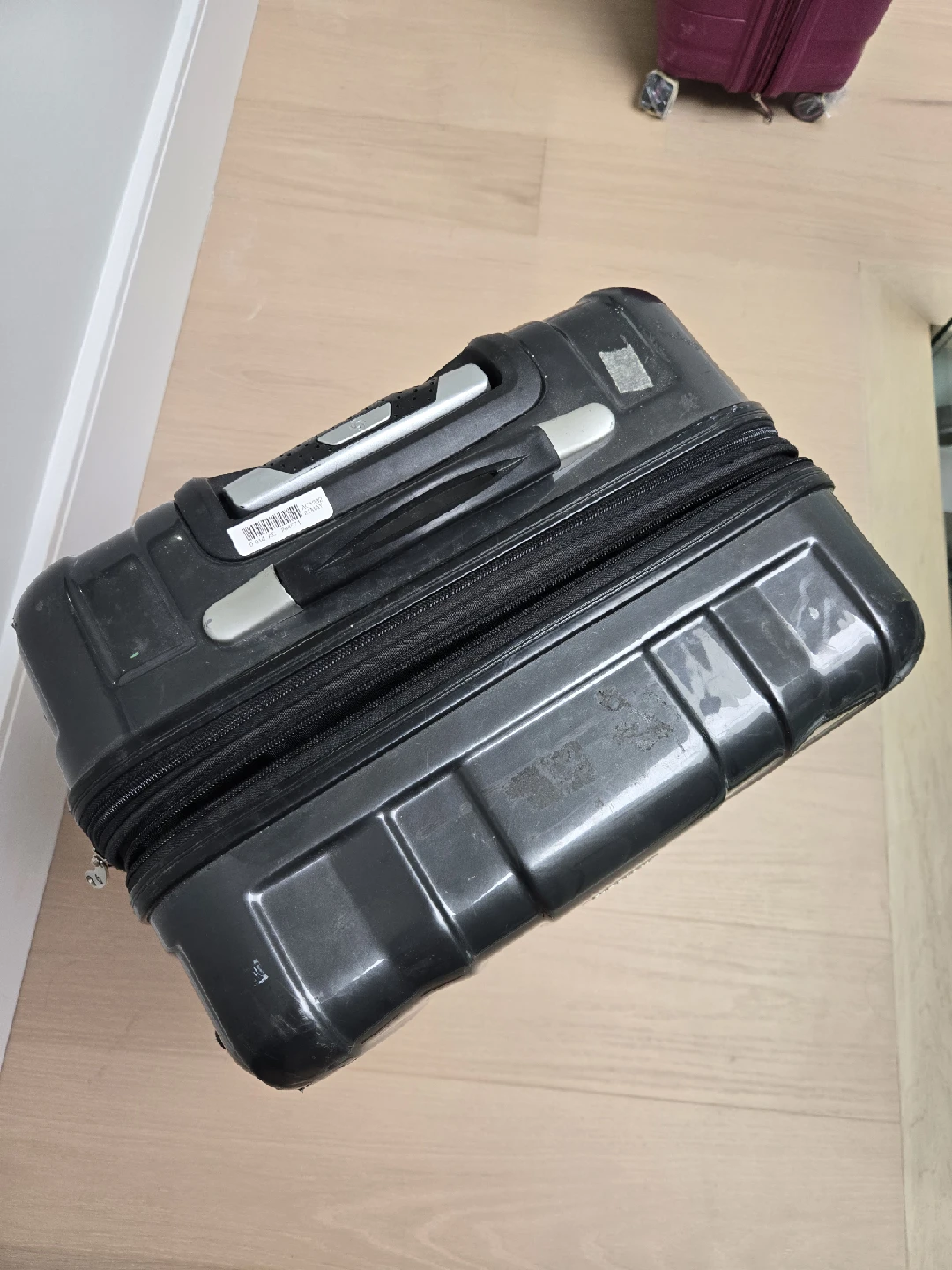 Selling a Samsonite carry-on suitcase in black. It has some signs of use, like a few scratches and travel stickers, but it's still working condition. Perfect for your next trip!