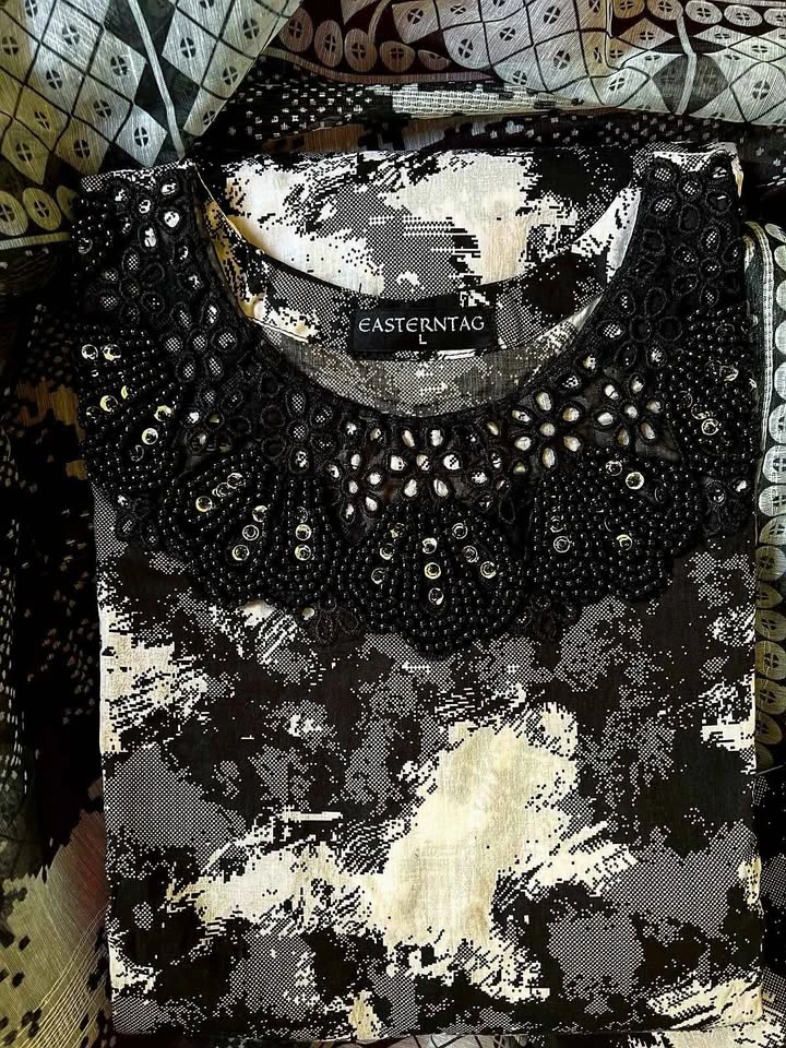 Beautiful 3 pcs suit with moti and patch work, cotton net dupatta