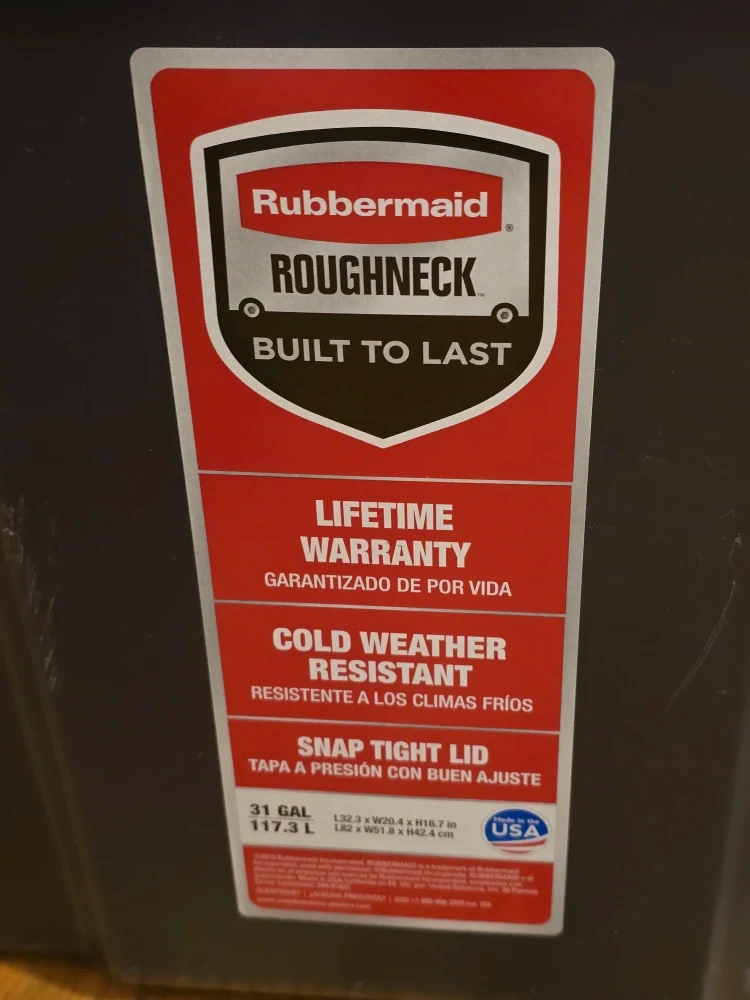 150Selling a Rubbermaid Roughneck storage bin. It's a 31-gallon container with a snap-tight lid. It's cold weather resistant and built to last. Great for storing items in the garage or attic!