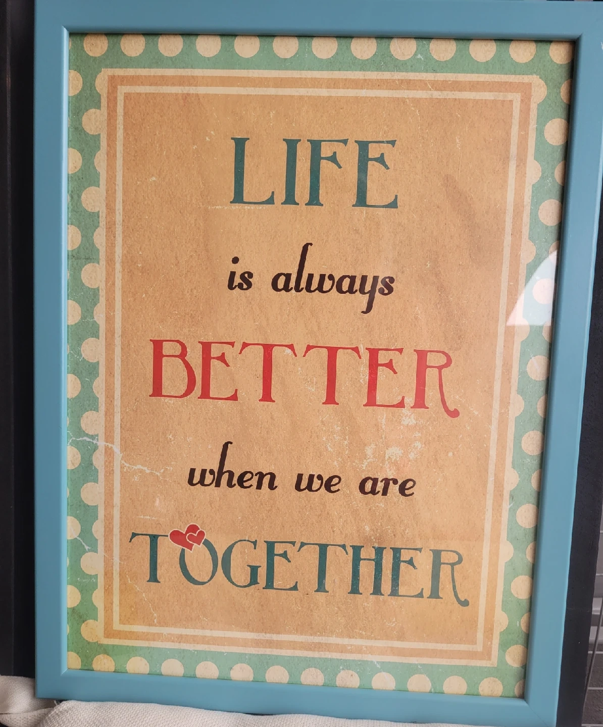 1000+This is a used Ikea FISKBO frame, perfect for adding a touch of charm to your space with its "Life is always better when we are together" print. The frame is in good condition and ready to hang. It could be the conversation starter you never knew you needed! This unique piece has been meticulously sourced and is looking for a new home where it can be appreciated. If you're reading this, yes, it's still available!