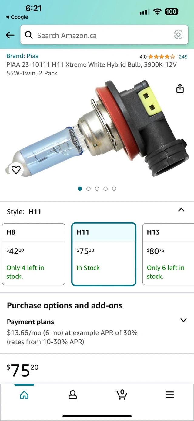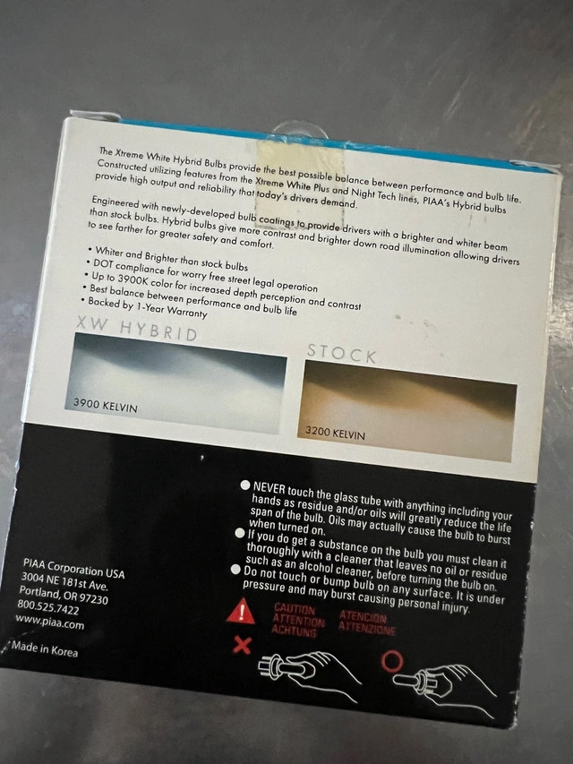 21PIAA Xtreme White Hybrid H11 - 12v 55w (3900k colour light) bulbs Excellent work and bright light Values $75 from Amazon Canada